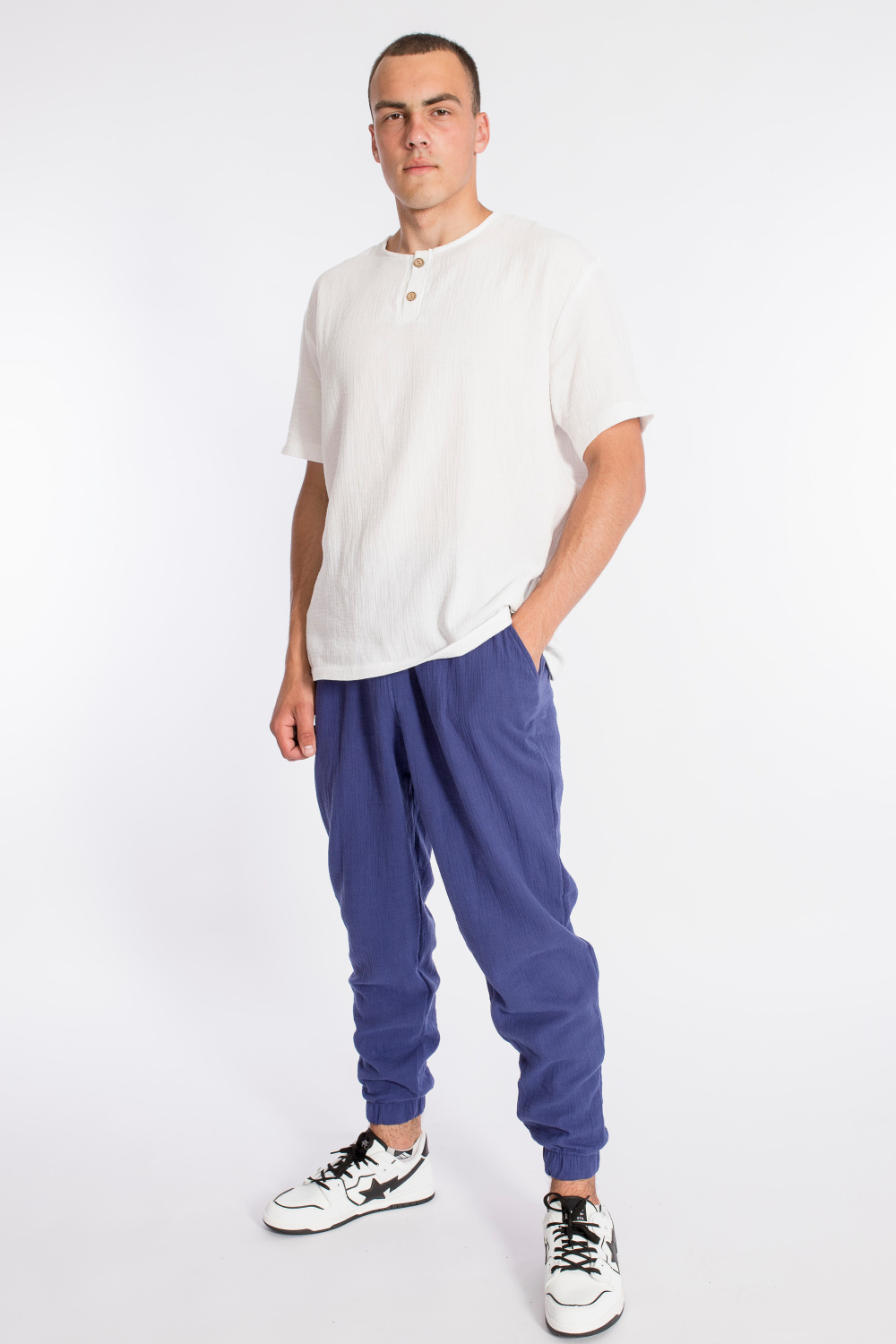 Мужские брюки выполнены из хлопкового полотна - муслина. Пояс притачной на резине и шнуре, по бокам размещены карманы. Низ брюк собран на резинку.
