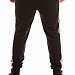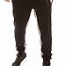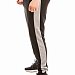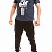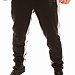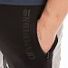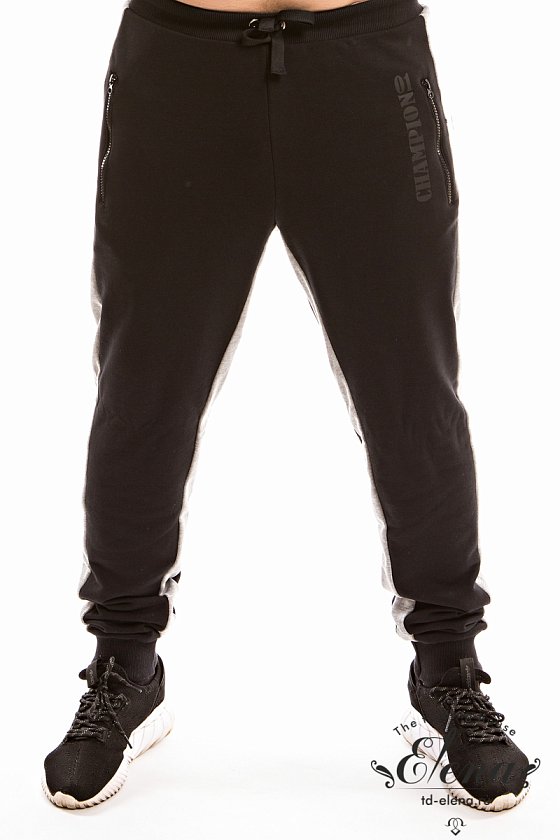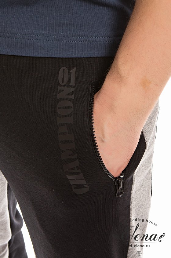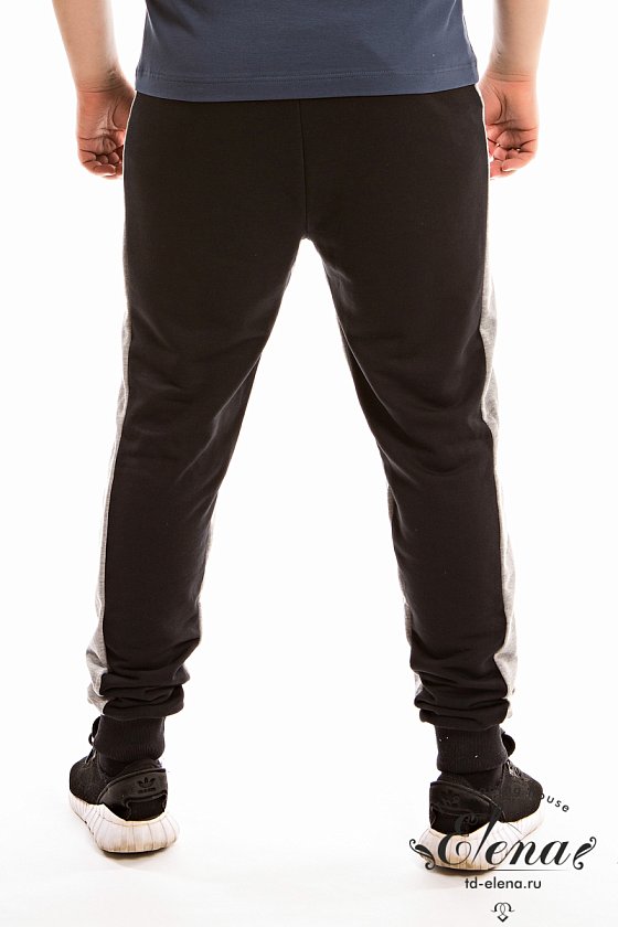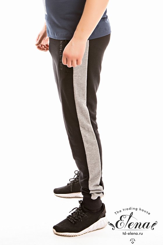 Брюки из футера трехнитки (воздушка) с контрастными вставками по бокам и шаговому шву. Пояс брюк притачной, на резинке, через люверсы проложен широкий шнур. Спереди размещены карманы на молниях, с левой стороны термопринт. Низ брюк на манжетах.