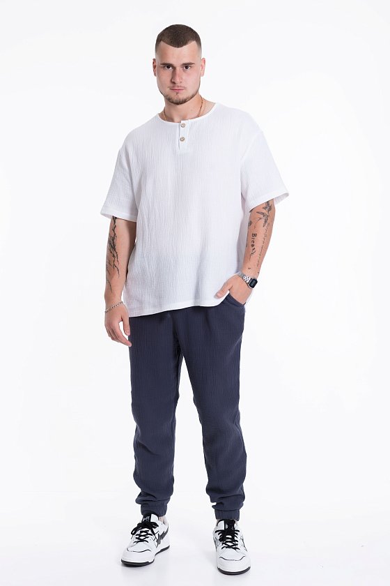 Мужские брюки выполнены из хлопкового полотна - муслина. Пояс притачной на резине и шнуре, по бокам размещены карманы. Низ брюк собран на резинку.