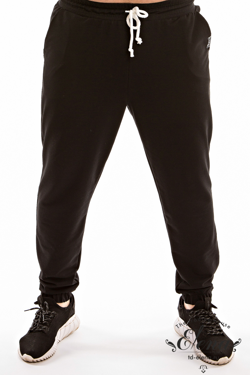 Брюки из однотонного футера с лайкрой. С притачным поясом на резине и шнуре, по бокам размещены карманы. На кармане декоративная нашивка. Низ брюк собран на резинку.