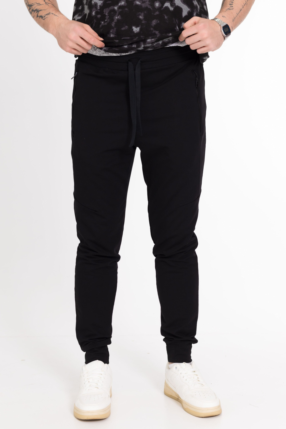 Брюки выполнены из однотонного футера с лайкрой. С притачным поясом и манжетами внизу. В поясе через петли проложен шнур. По бокам размещены карманы на молнии и сделаны декоративные вытачки в области колен.