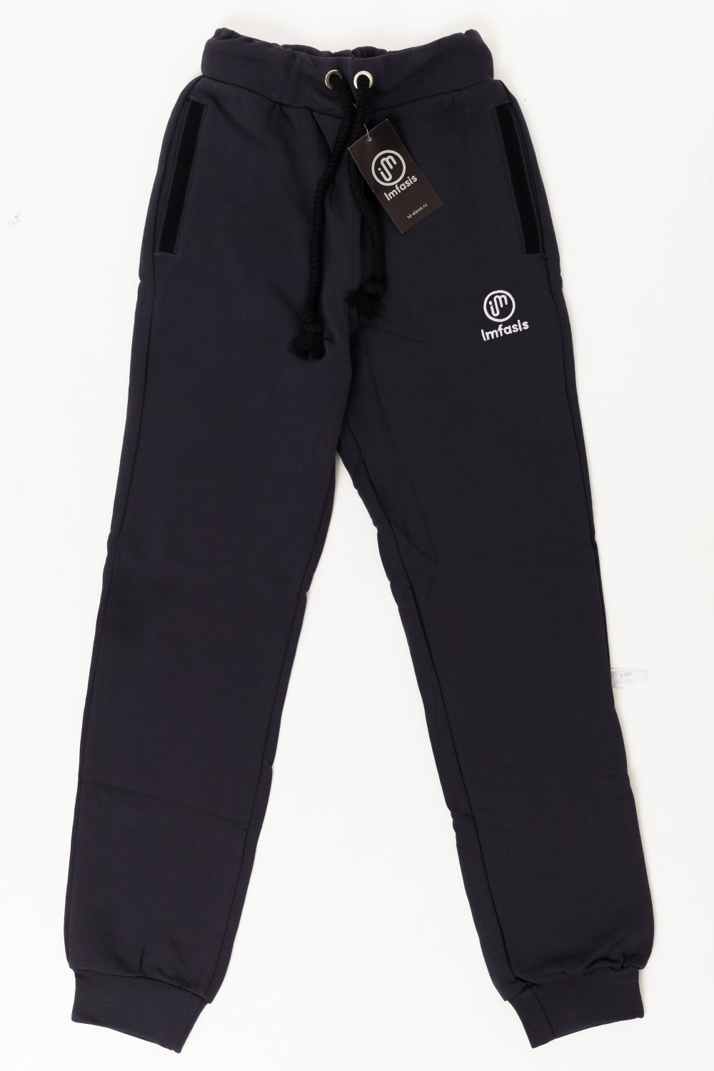 Брюки мужские с вышивкой, по бокам расположены карманы, сзади один карман на молнии. Пояс брюк на резине и шнуре, низ на манжетах. Материал футер трёхнитка (воздушка).