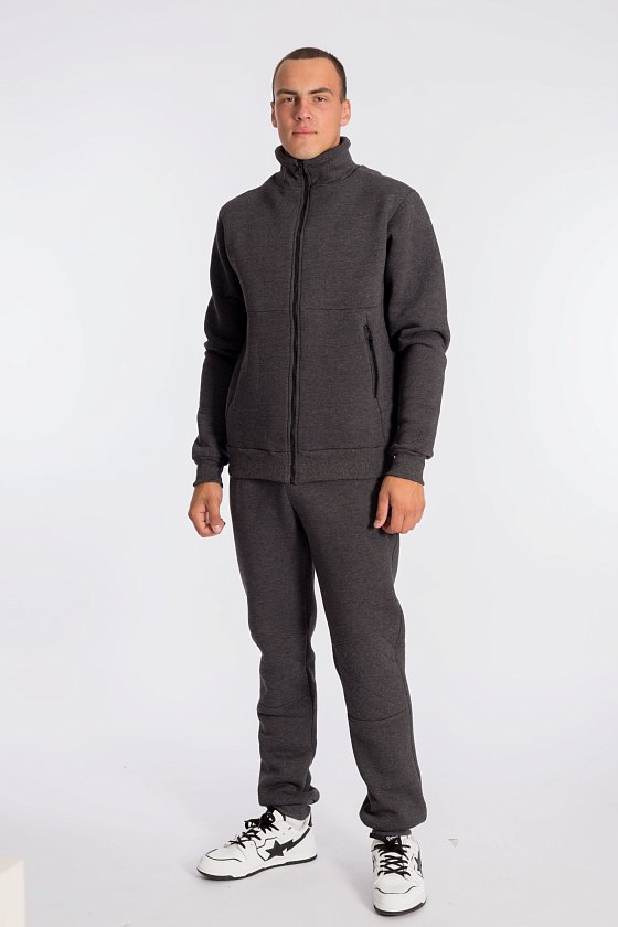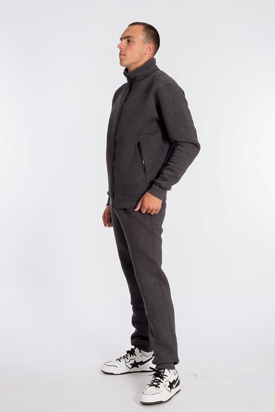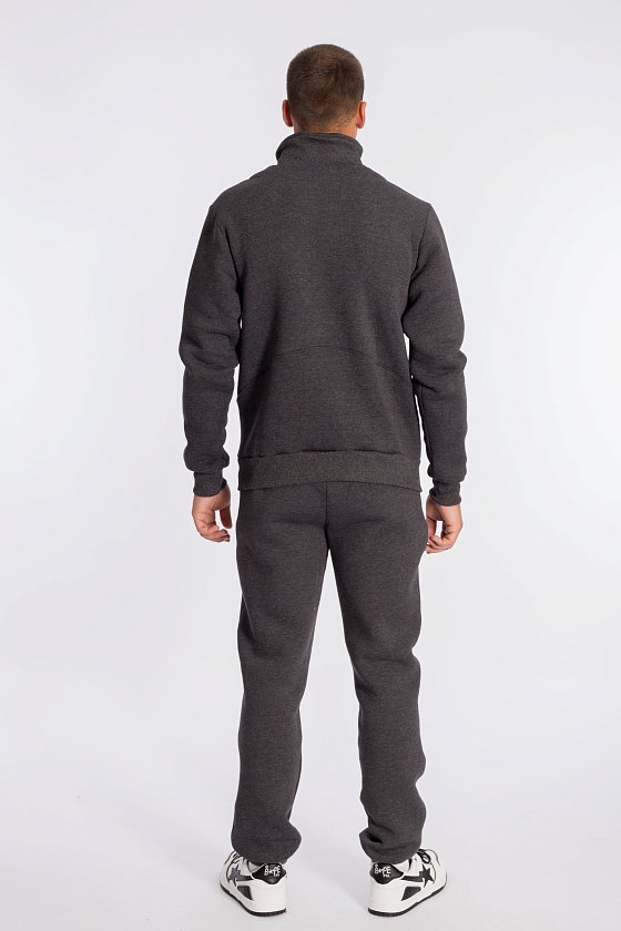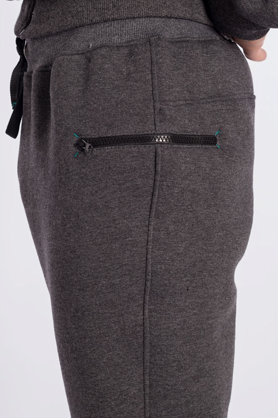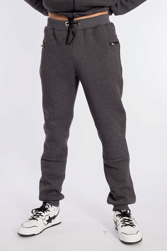 Брюки мужские, однотонные (начёс 3-х нитка), с поясом на широкой резинке со шнуром. По бокам в качестве отделки вшита молния (имитация под карман), сзади декоративная нашивка. На коленях отстрочка нитками в цвет полотна, низ брюк на манжетах.