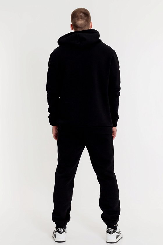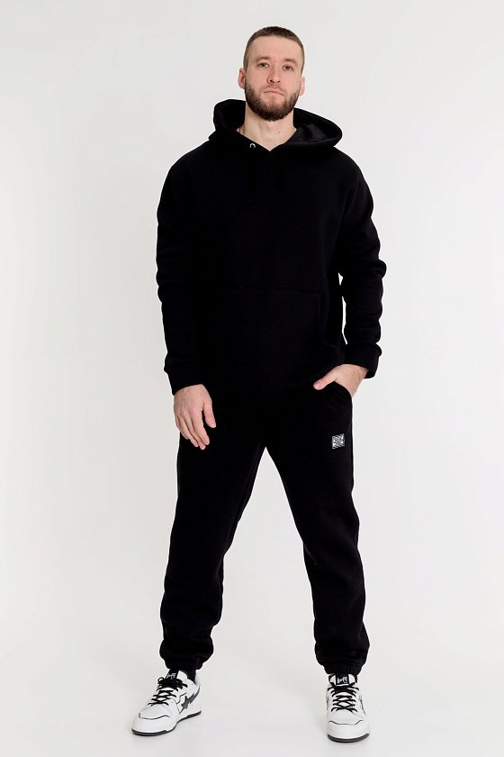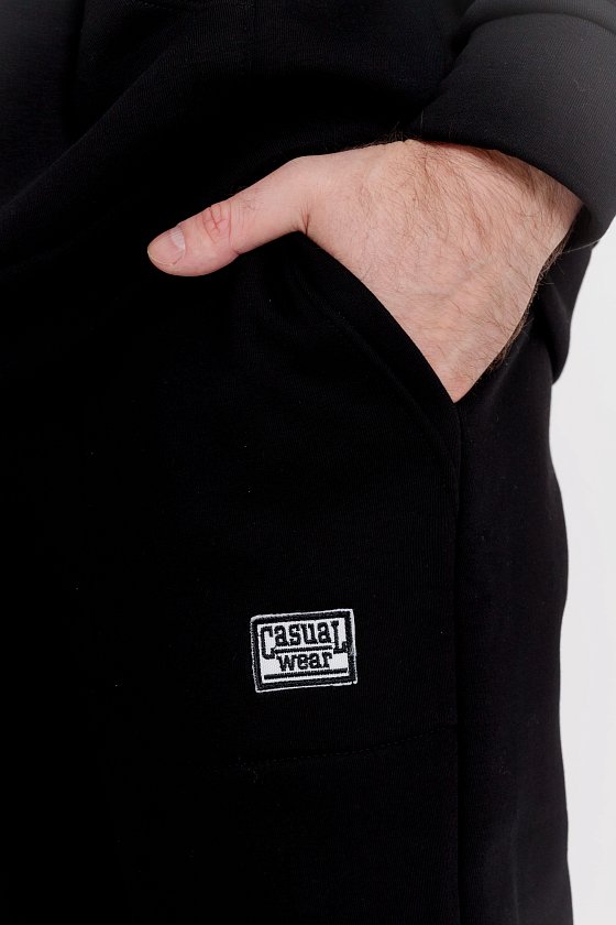 Мужские брюки выполнены из полотна с начёсом. По бокам расположены карманы. Пояс на резине и шнуре, по низу брюк резина.