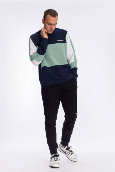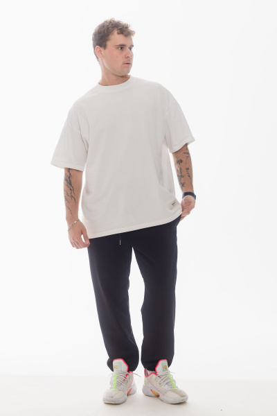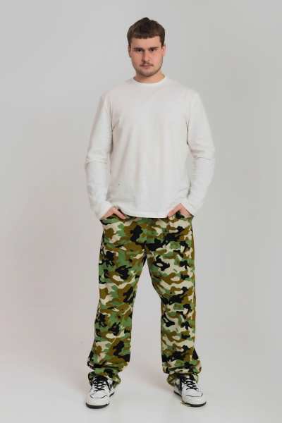 Мужские брюки с карманами по бокам выполнены из полотна с начёсом. Пояс брюк на резинке.
