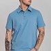 Футболка-поло выполнена из однотонного пике голубого цвета. Футболка с воротником-стойкой, коротким втачным рукавом на узкой манжете и застежкой на пуговицы. С левой стороны вышивка фирменного логотипа в цвет поло.