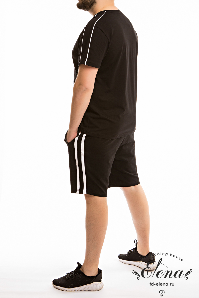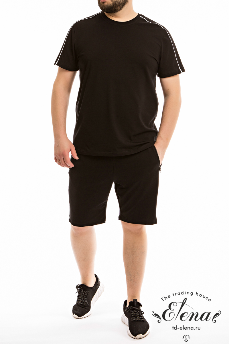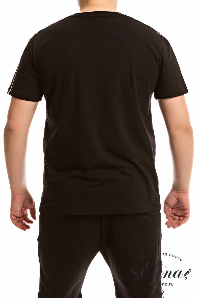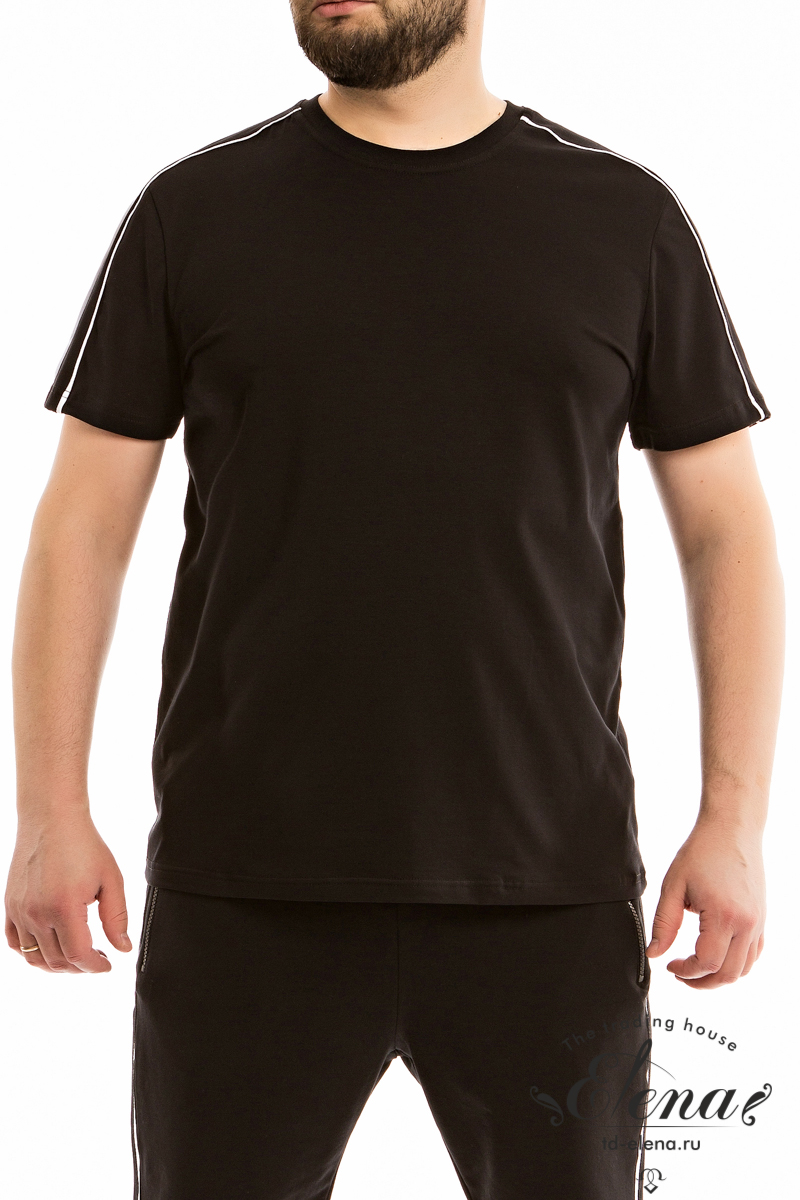 Мужская футболка выполнена из кулирки с лайкрой. В плечевой части отделочные полосы. Футболка с коротким рукавом и круглым вырезом горловины с притачной планкой из рибаны.