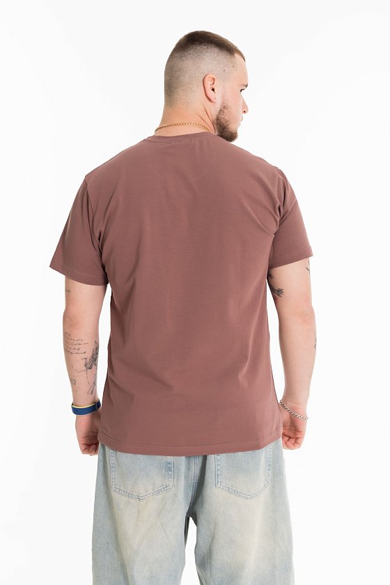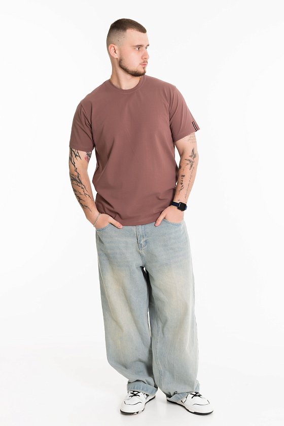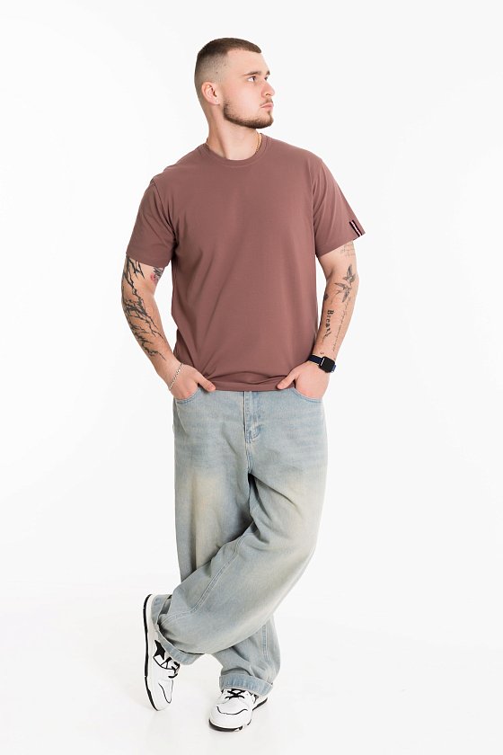 Мужская футболка выполнена из хлопкового полотна с лайкрой. Футболка с коротким рукавом и круглым вырезом горловины. Слева на рукаве расположена декоративная лента.