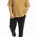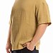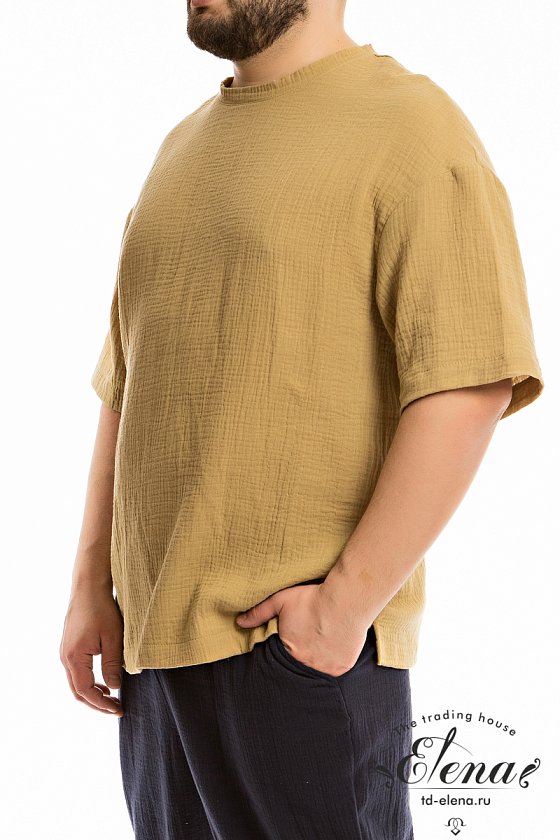 Мужская футболка из однотонного муслина со спущенной линией плеча. По низу футболки в боковых швах небольшие разрезы. Круглый вырез горловины оформлен притачной планкой.