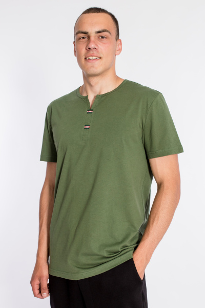 Футболка выполнена из однотонного хлопкового полотна. С коротким втачным рукавом. Горловина с декоративной планкой, обработана бейкой.