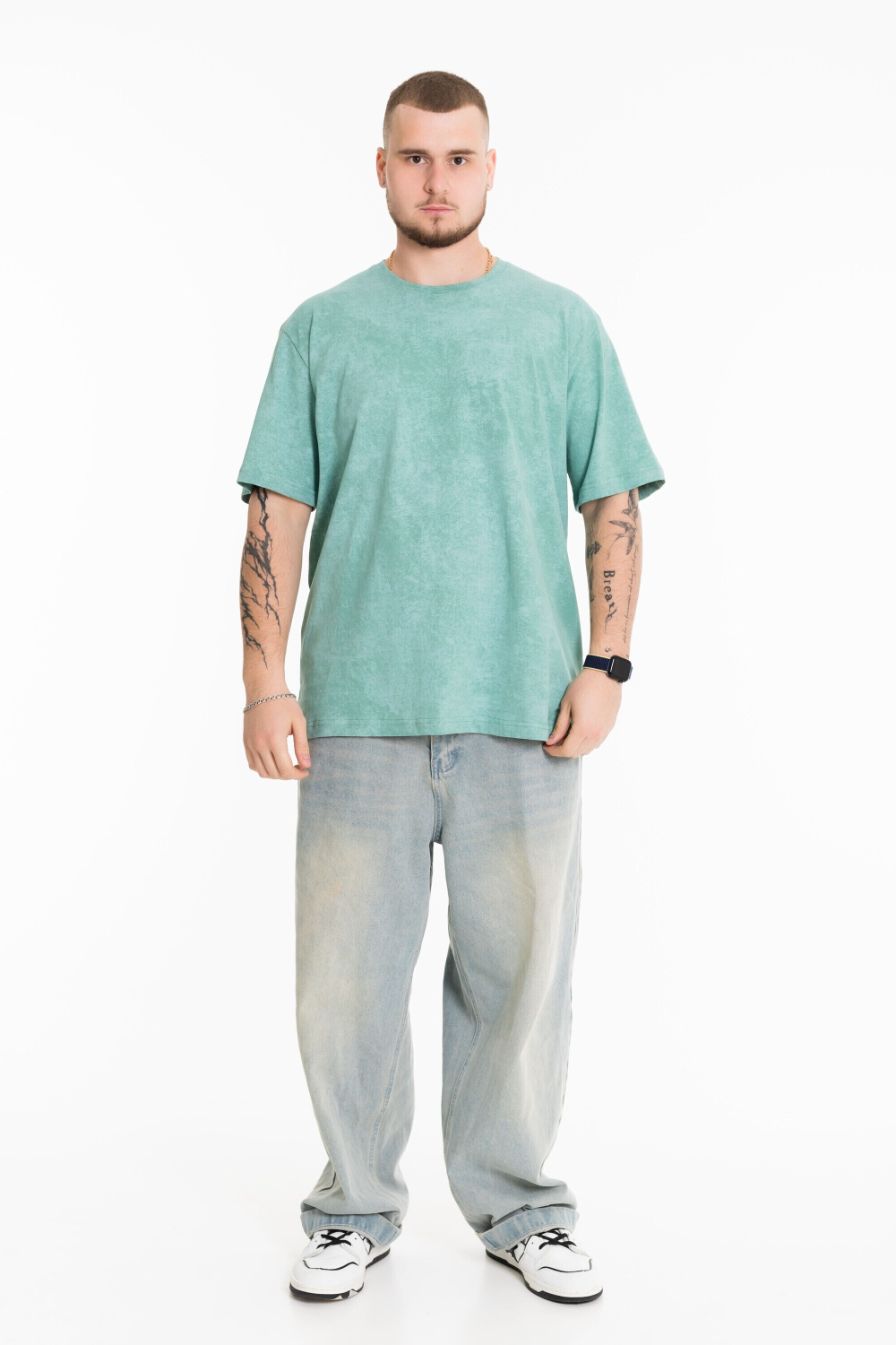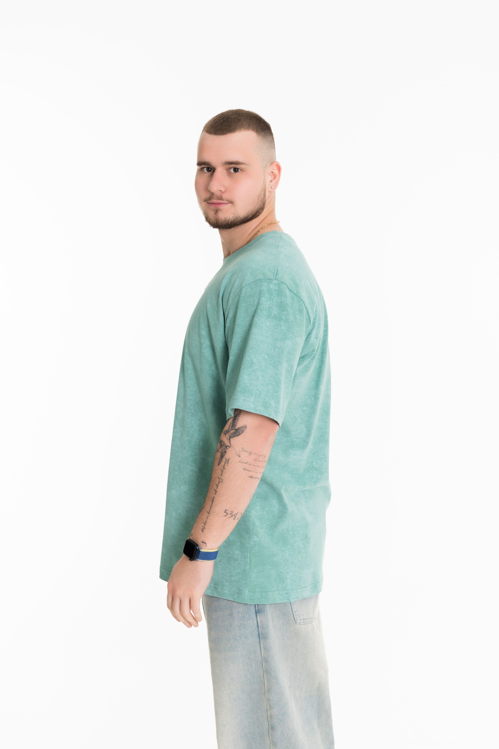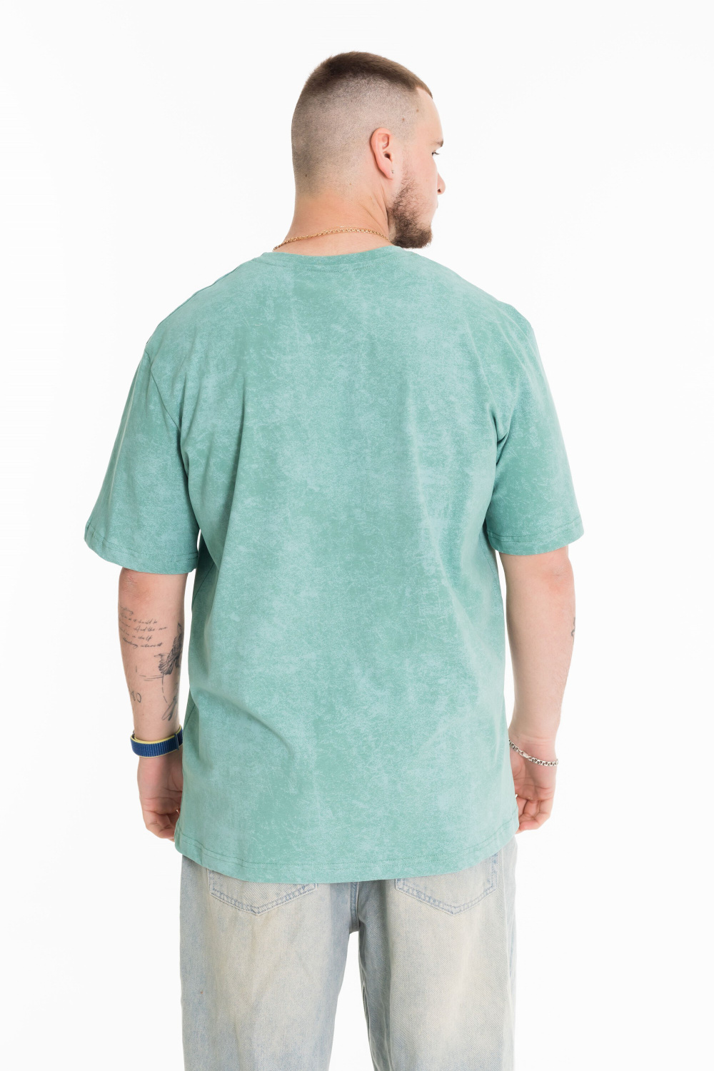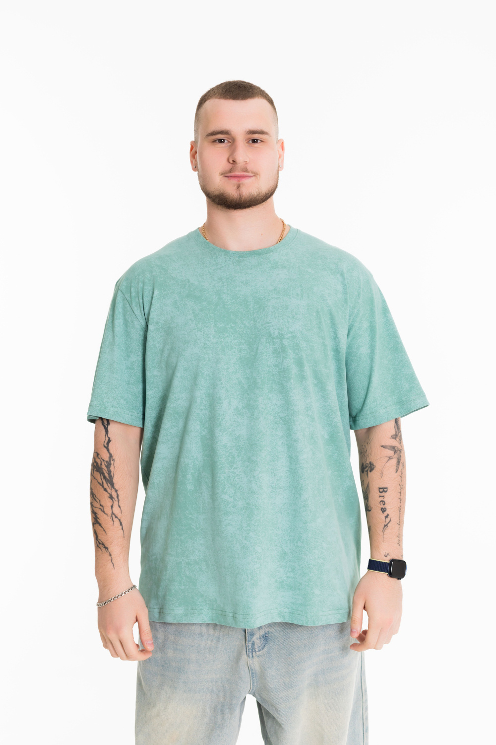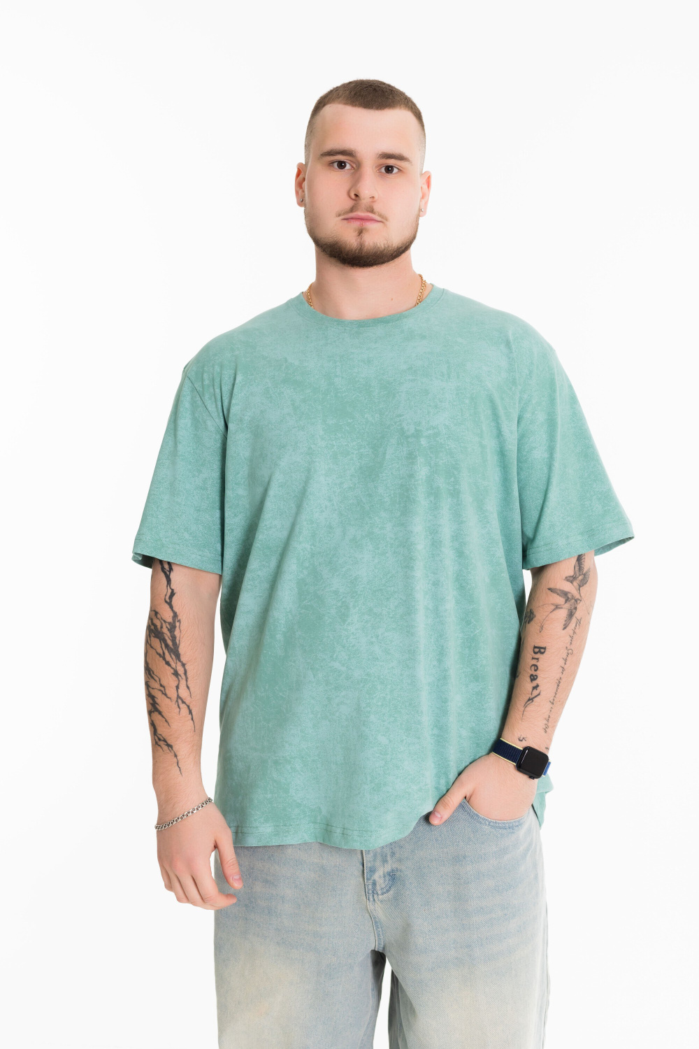 Мужская футболка из лёгкой и приятной к телу ткани — отличный выбор для повседневного гардероба. Изготовлена из кулирки цвета "ментол", имеет свободный силуэт и круглый вырез горловины. Футболка идеально подойдёт для отдыха или домашней носки.