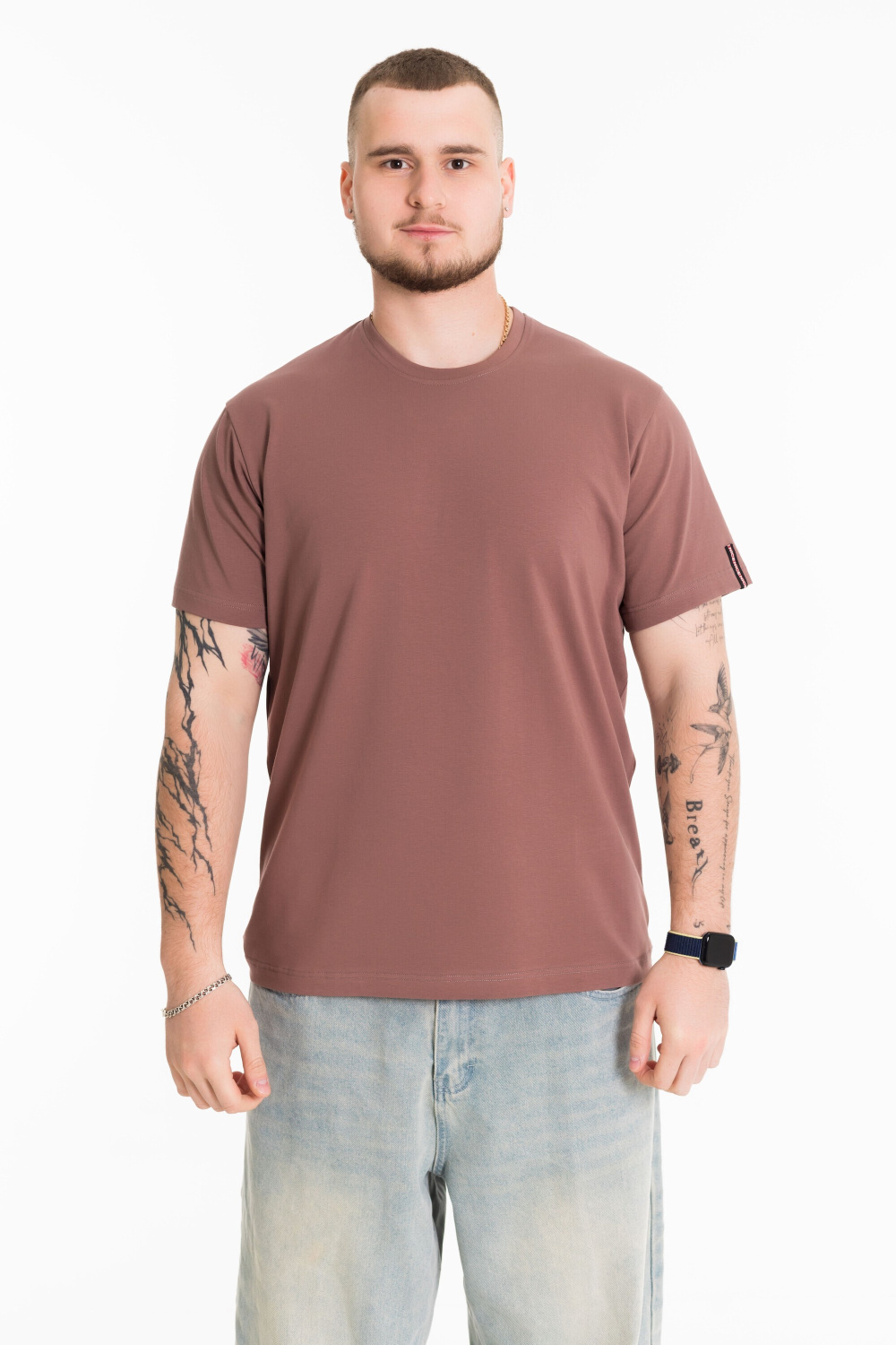 Мужская футболка выполнена из хлопкового полотна с лайкрой. Футболка с коротким рукавом и круглым вырезом горловины. Слева на рукаве расположена декоративная лента.