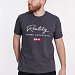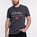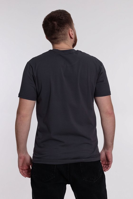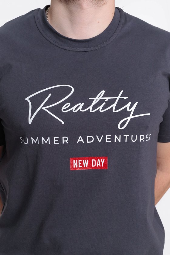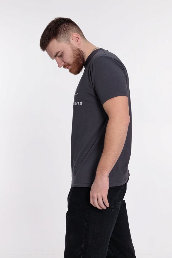 Мужская футболка выполнена из однотонного х/б полотна с лайкрой. Круглый вырез горловины оформлен планкой, рукава короткие. Спереди нанесён принт.
