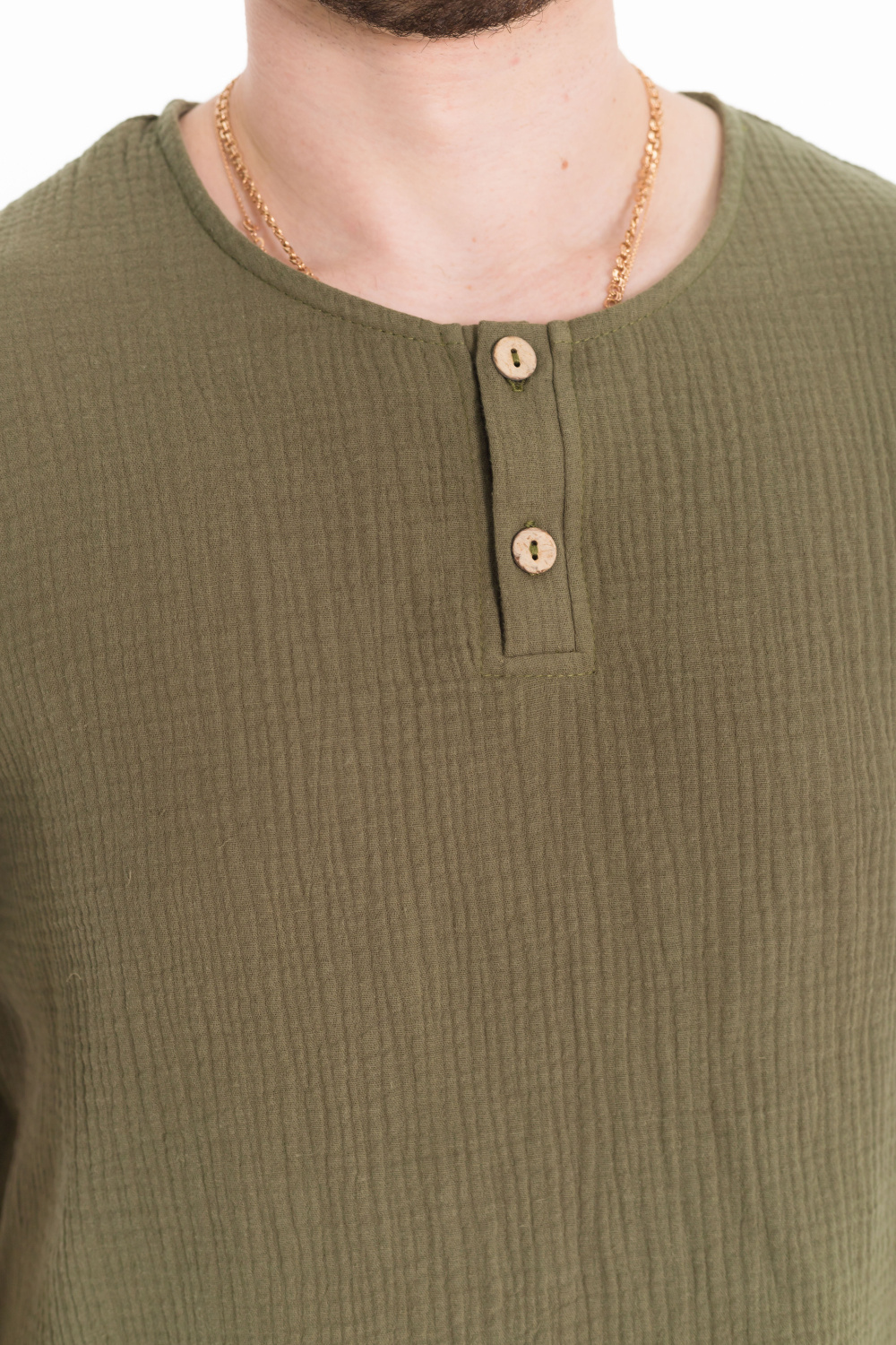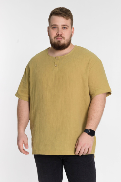 Мужская футболка выполнена из хлопкового полотна - муслина. Силуэт футболки свободный, линия плеча спущена. Круглый вырез горловины с застёжкой на две пуговицы, низ футболки разноуровневый.