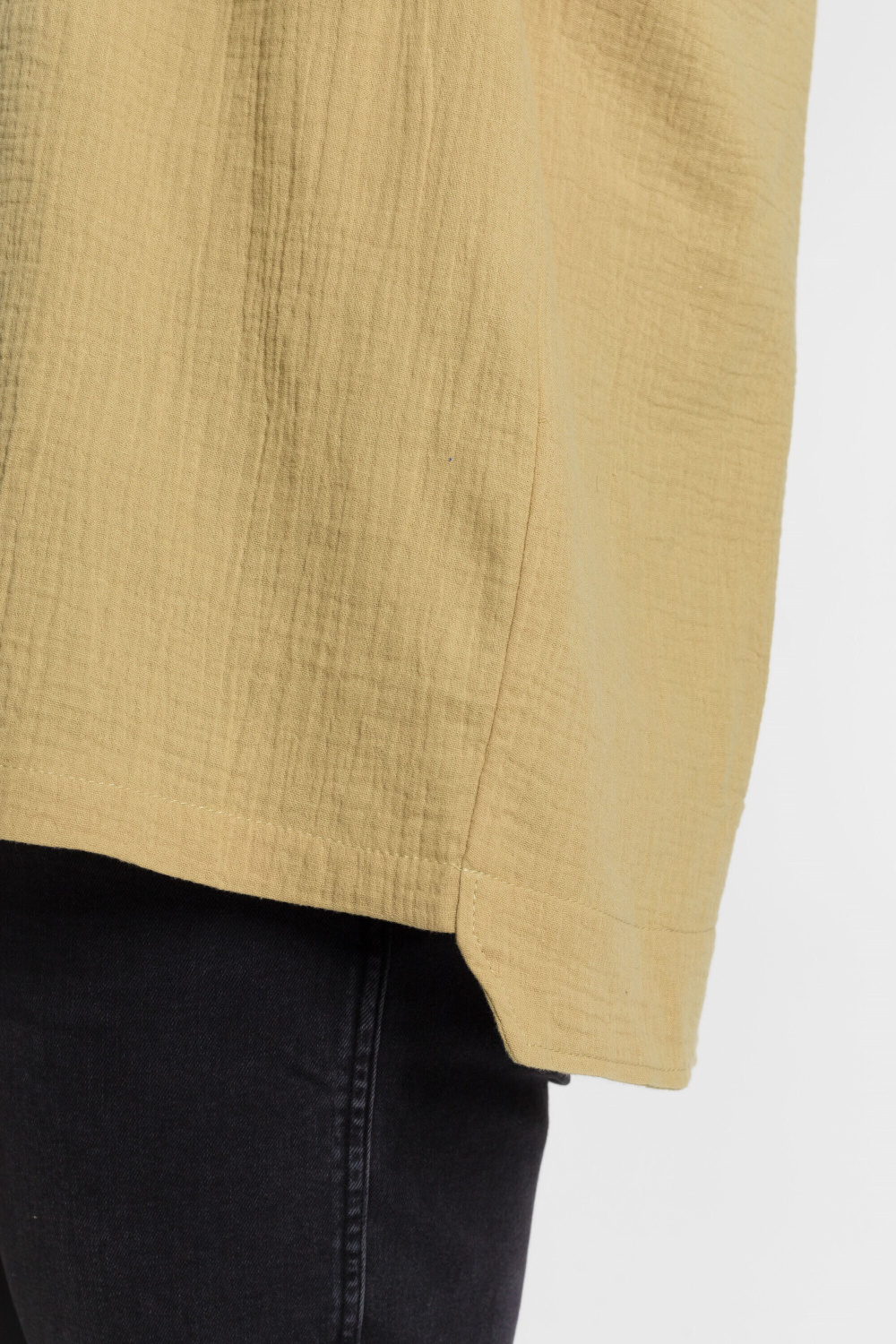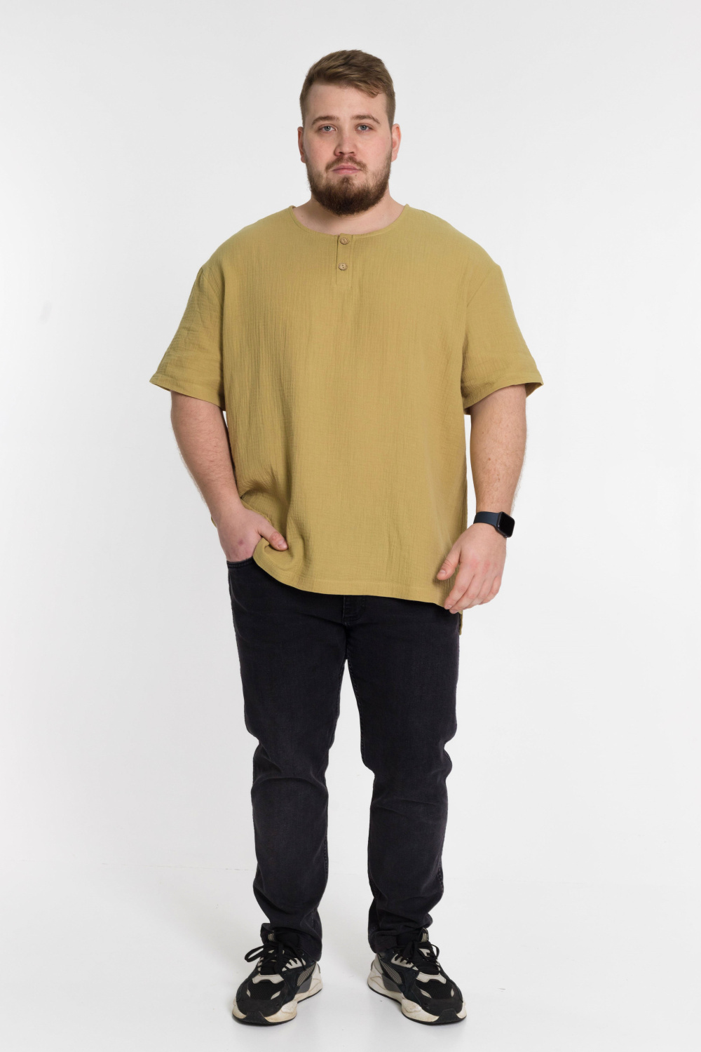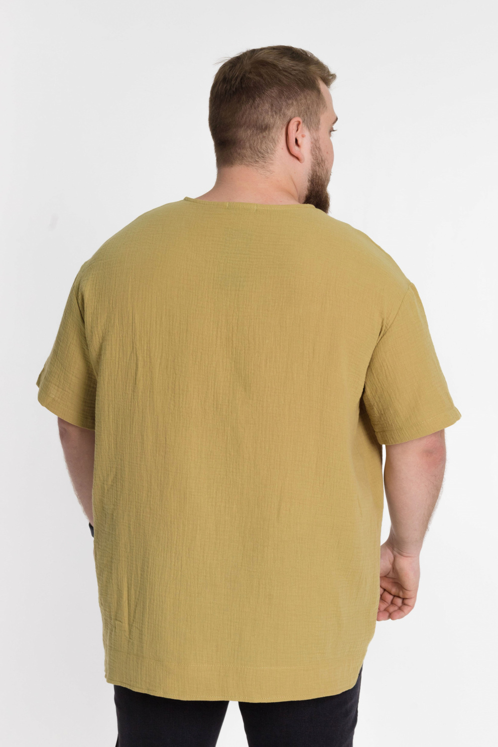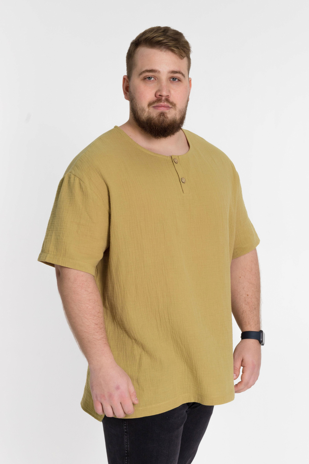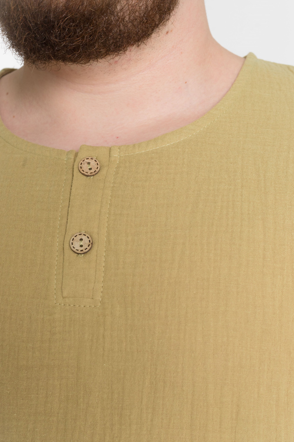 Мужская футболка выполнена из хлопкового полотна - муслина. Силуэт футболки свободный, линия плеча спущена. Круглый вырез горловины с застёжкой на две пуговицы, низ футболки разноуровневый.
