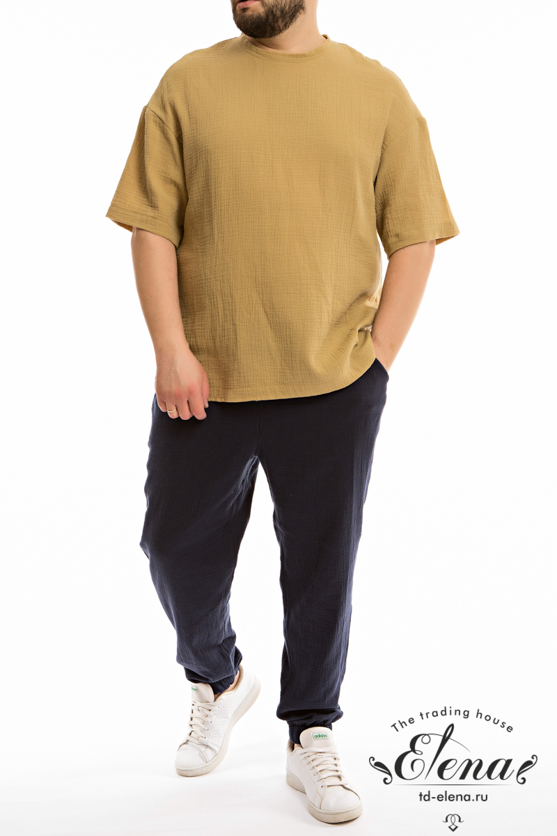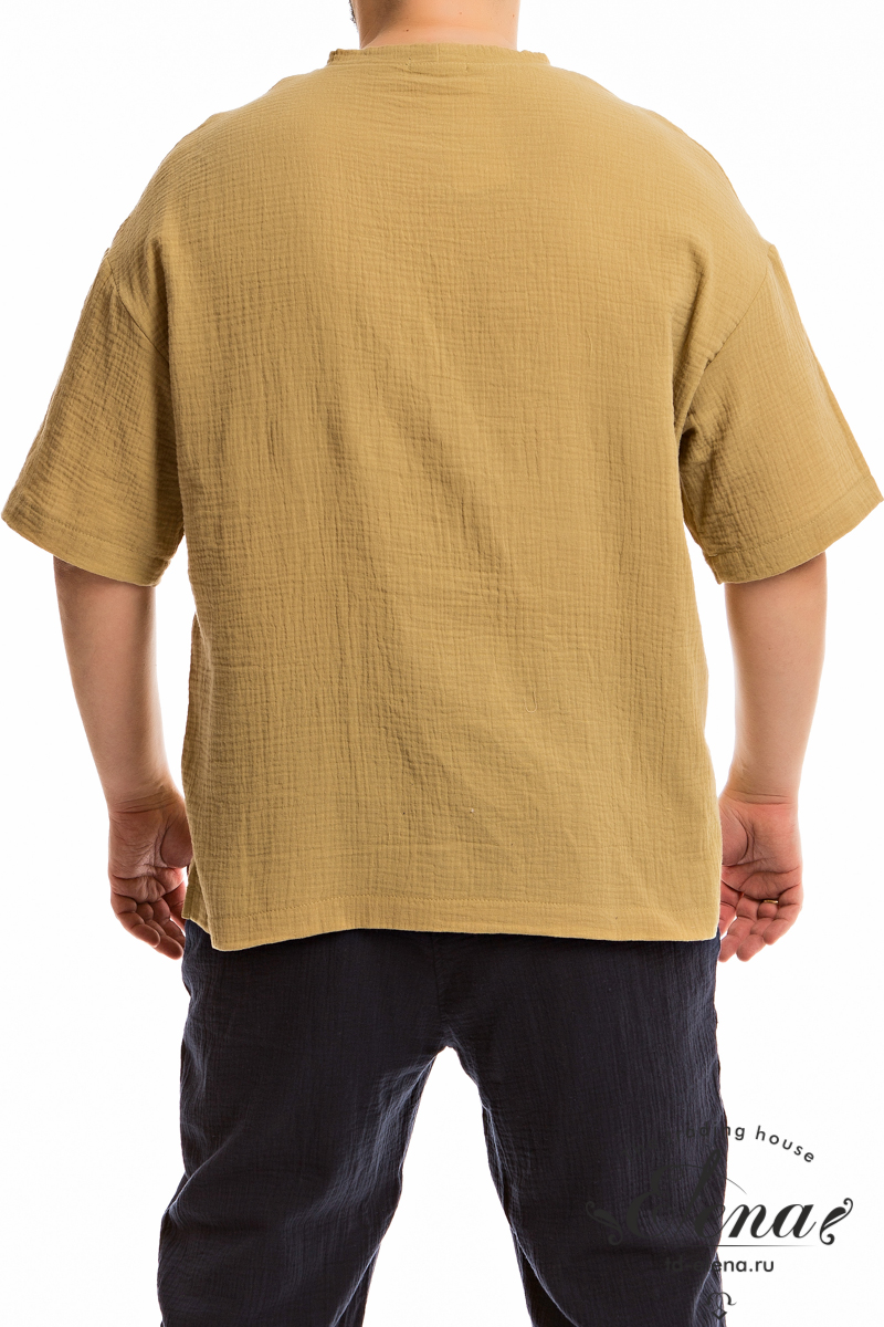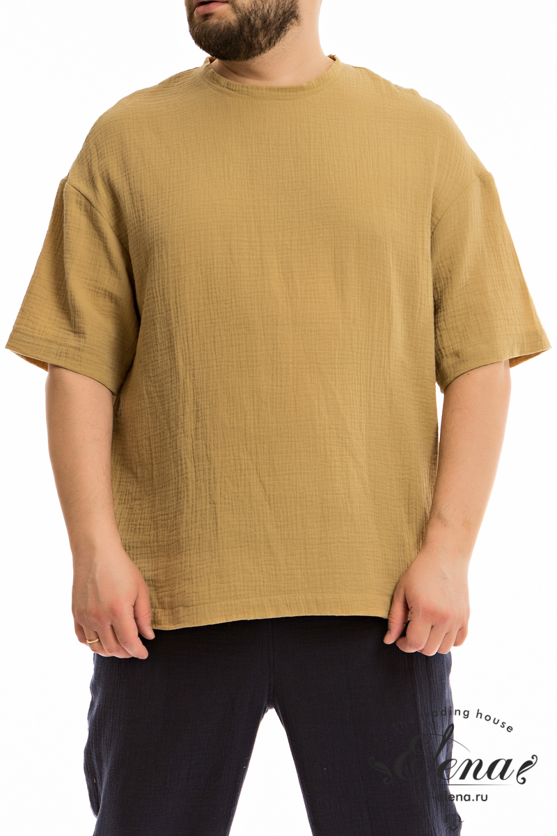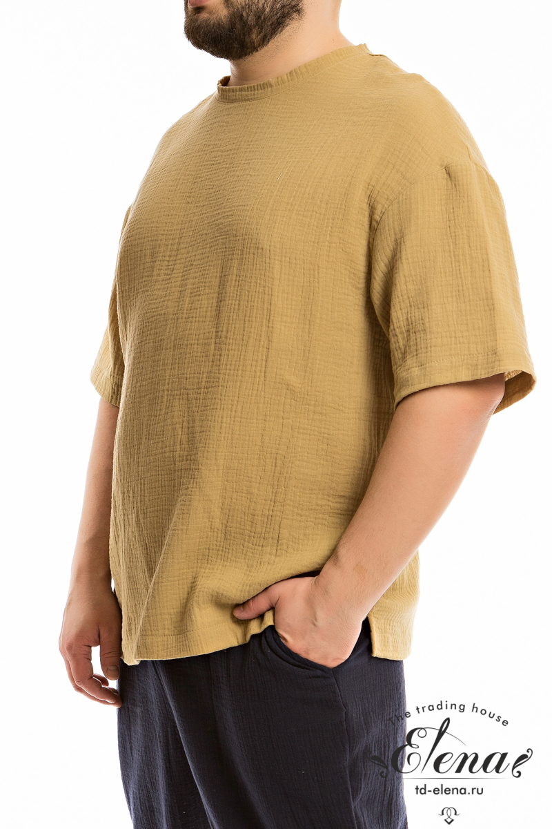 Мужская футболка из однотонного муслина со спущенной линией плеча. По низу футболки в боковых швах небольшие разрезы. Круглый вырез горловины оформлен притачной планкой.