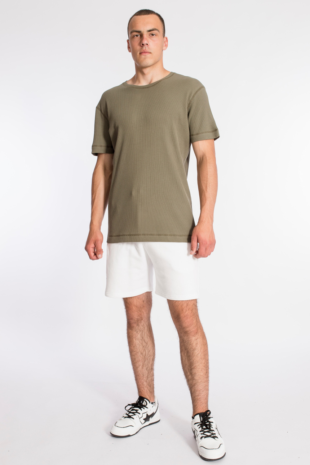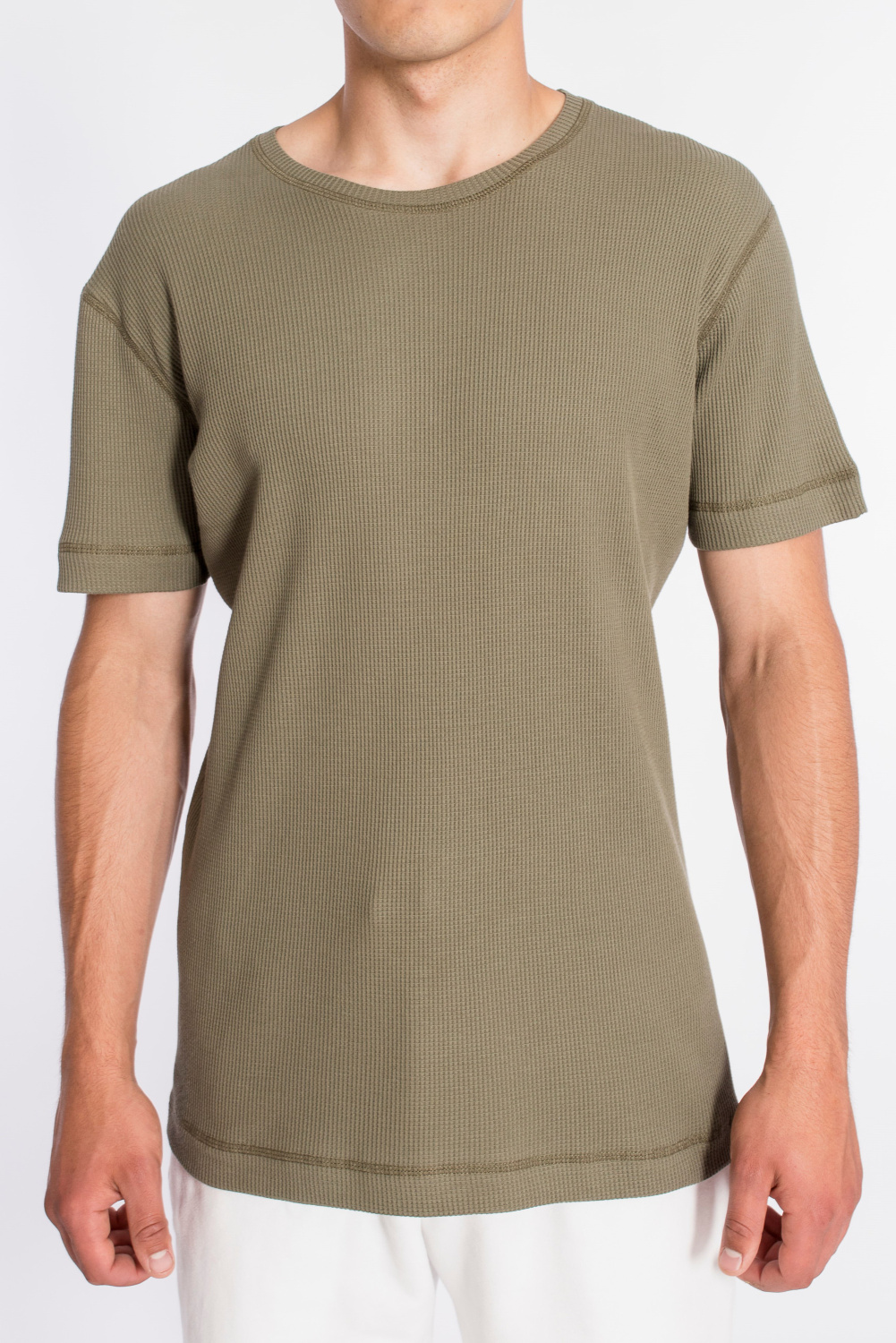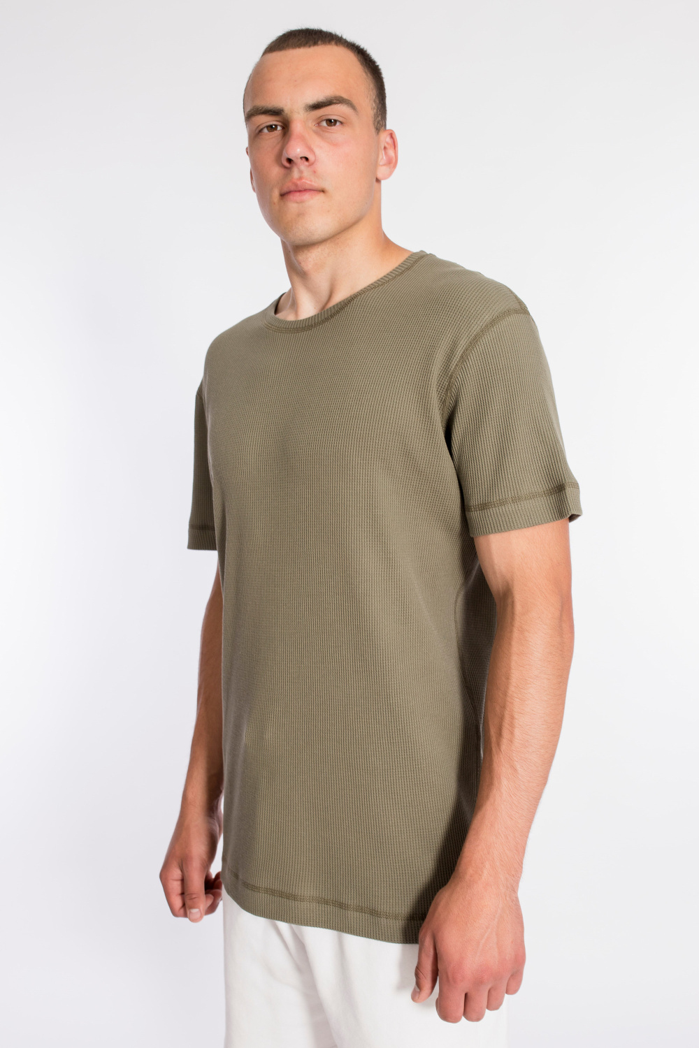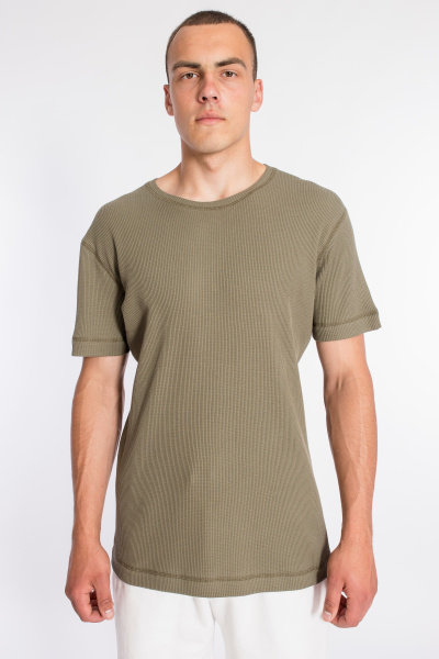 Мужская футболка выполнена из интерлочного полотна с фактурой "вафля". С коротким рукавом и круглым вырезом горловины.