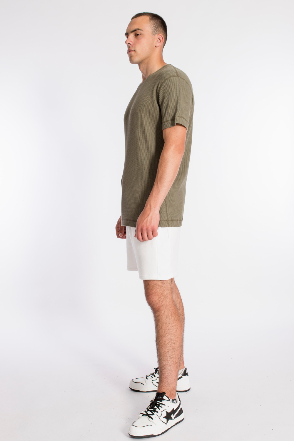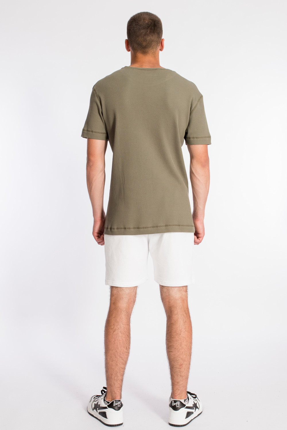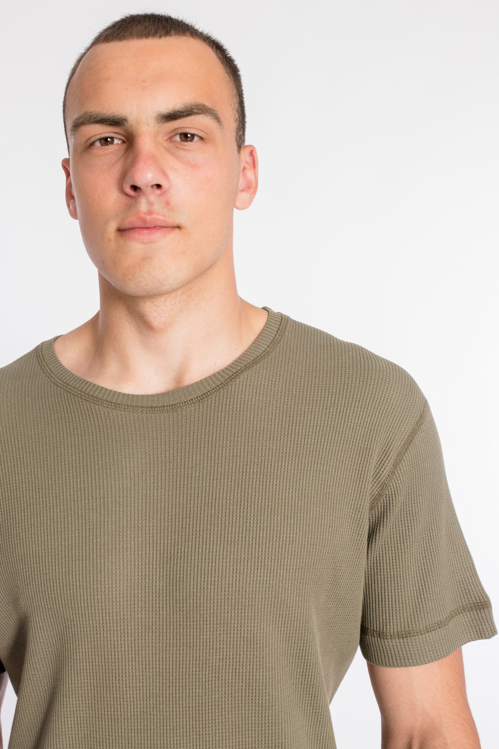 Мужская футболка выполнена из интерлочного полотна с фактурой "вафля". С коротким рукавом и круглым вырезом горловины.