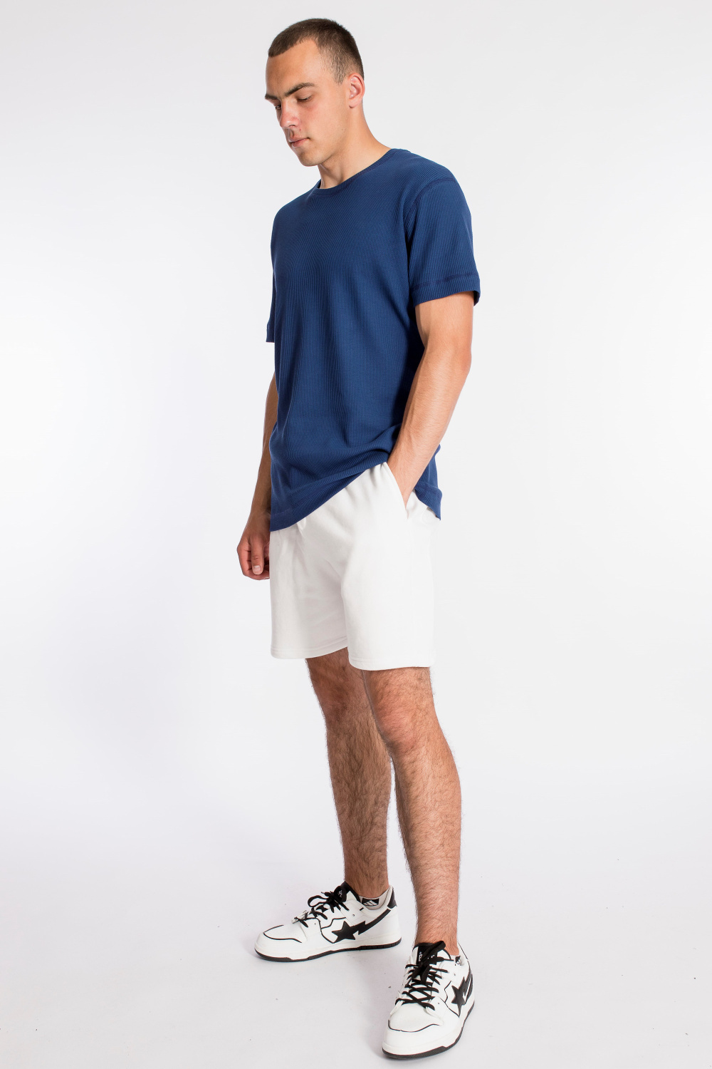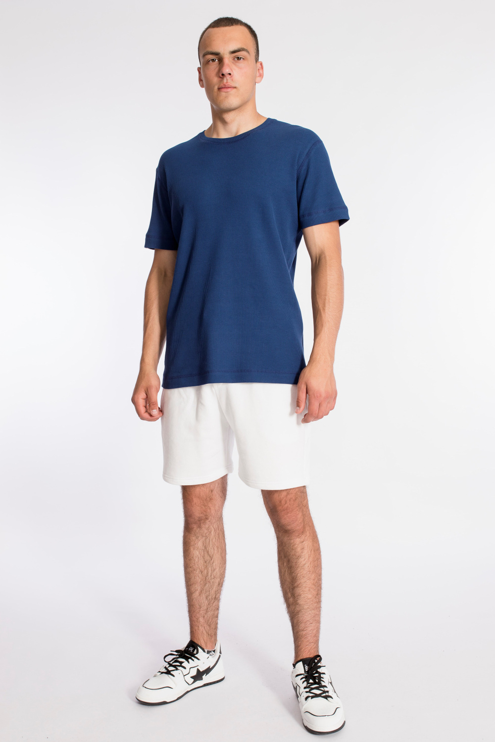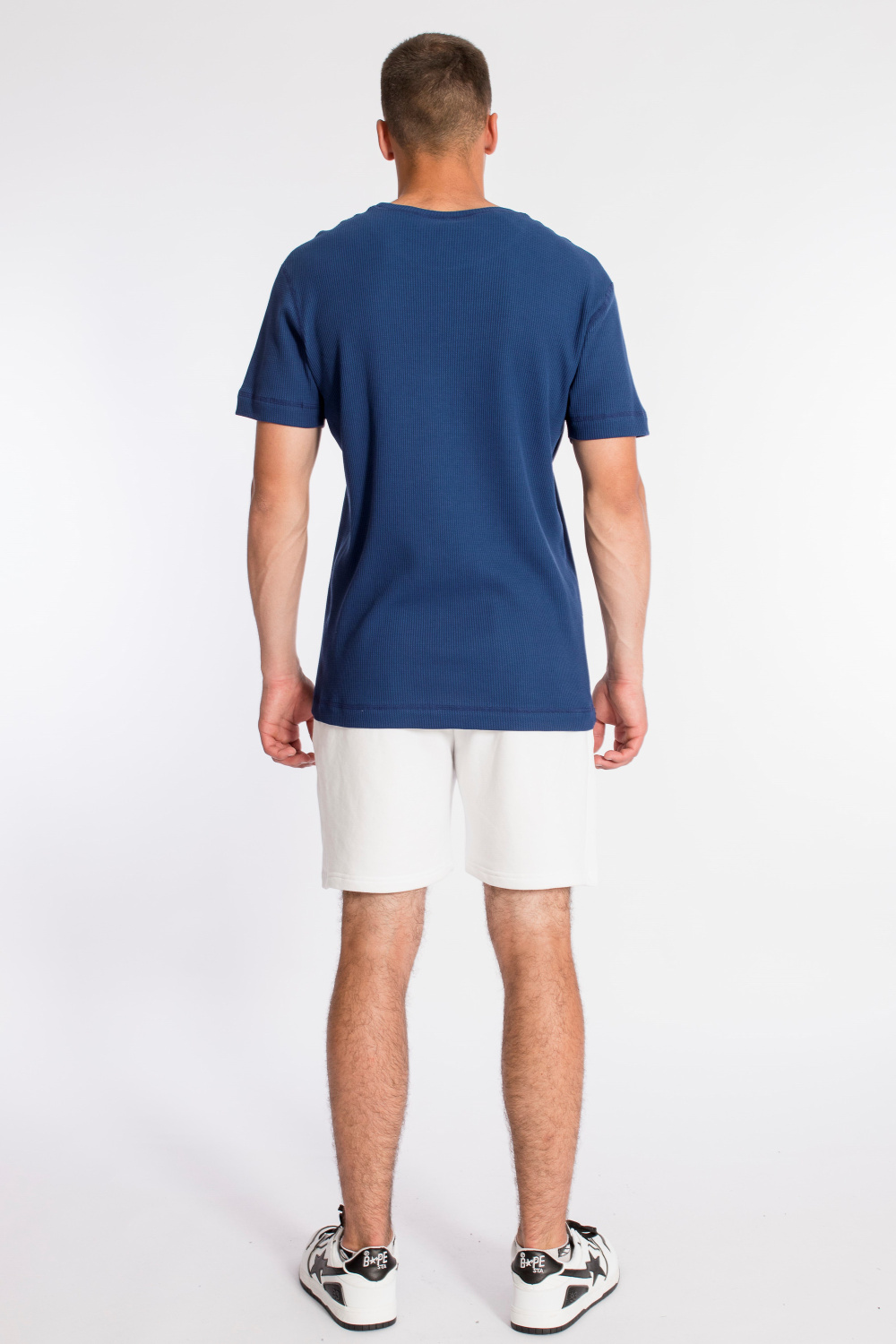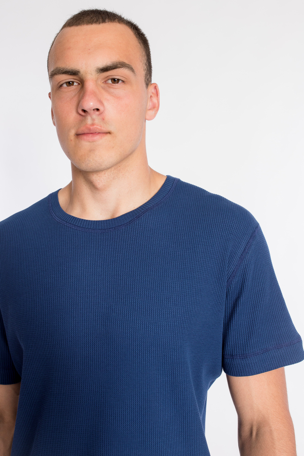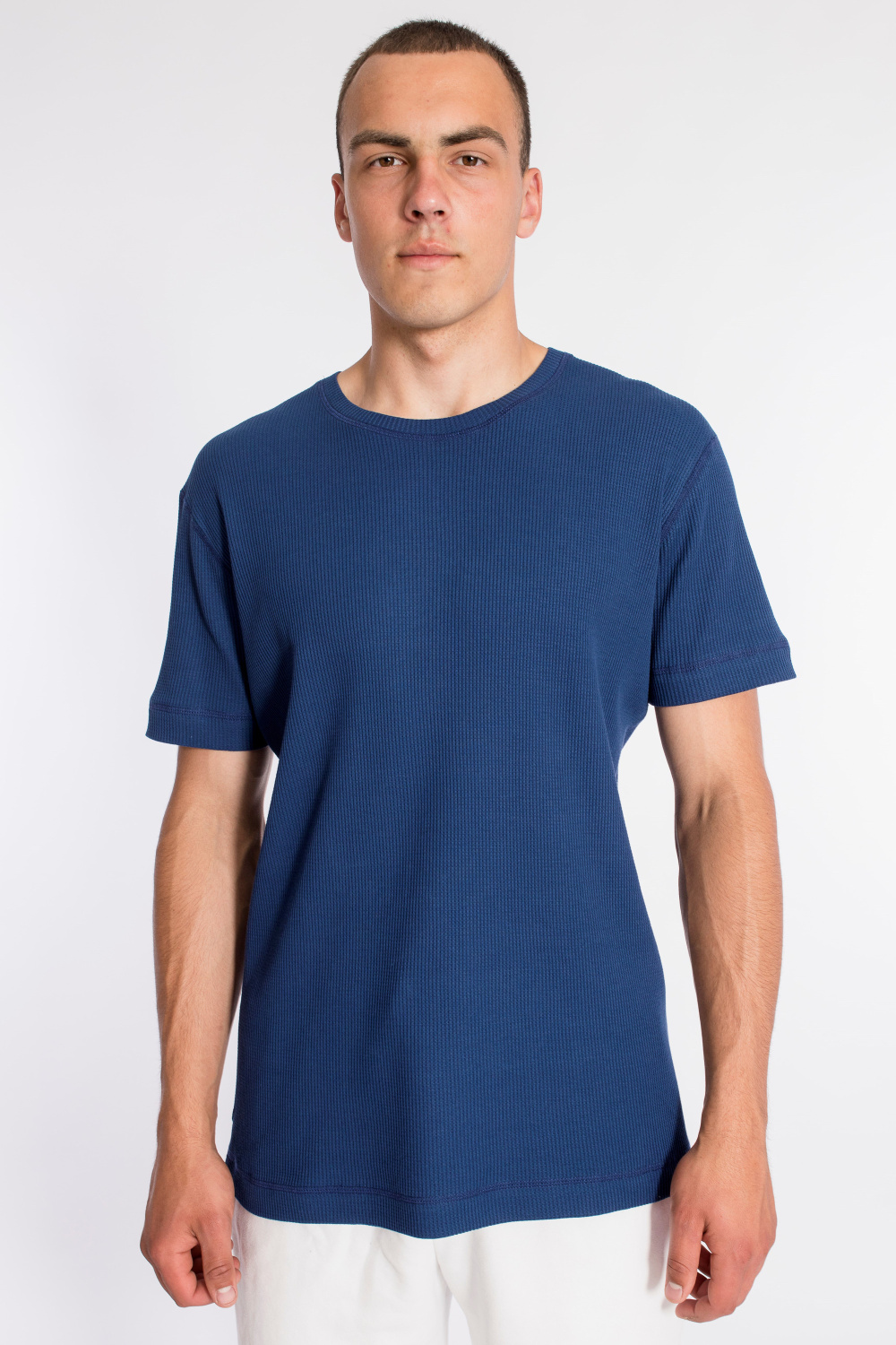 Мужская футболка выполнена из интерлочного полотна с фактурой "вафля". С коротким рукавом и круглым вырезом горловины.
