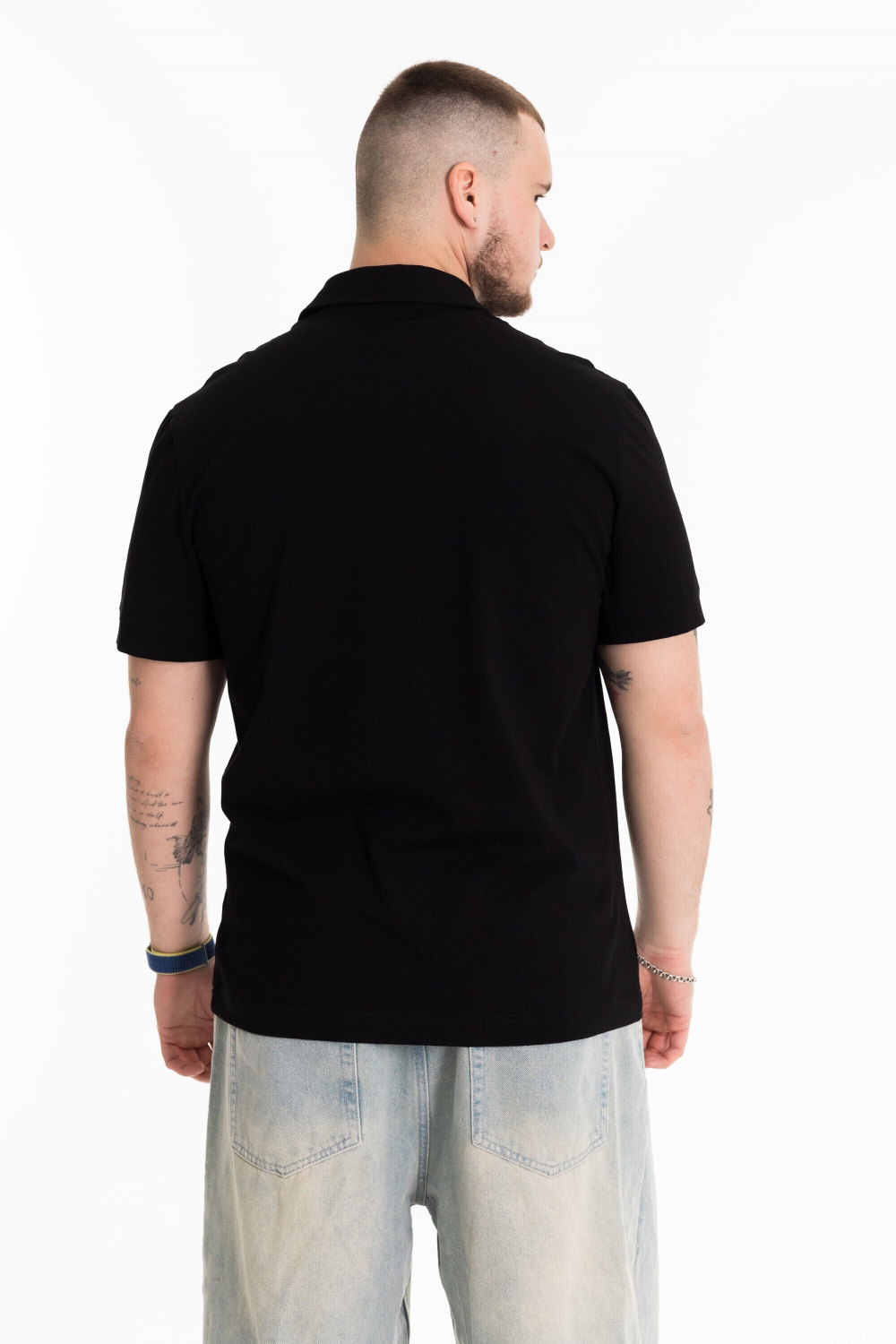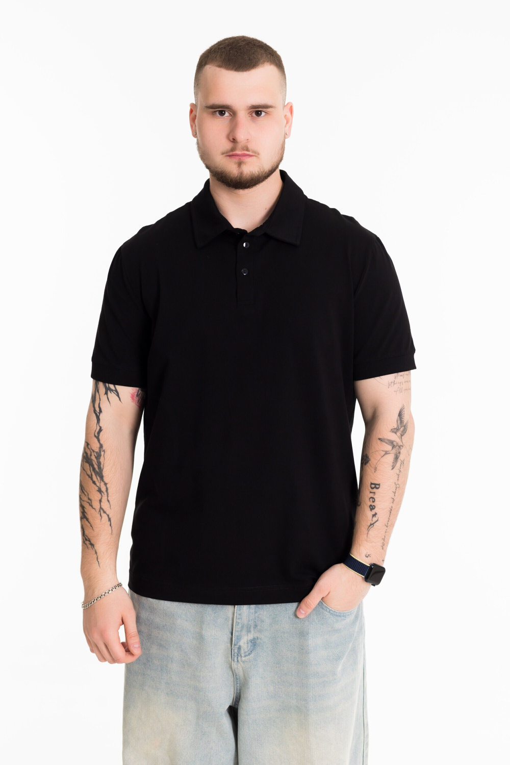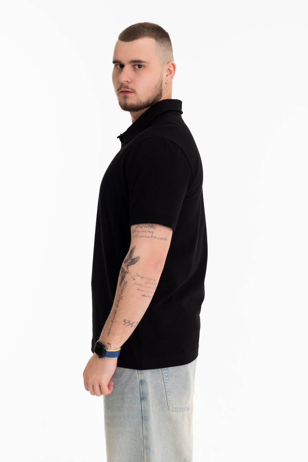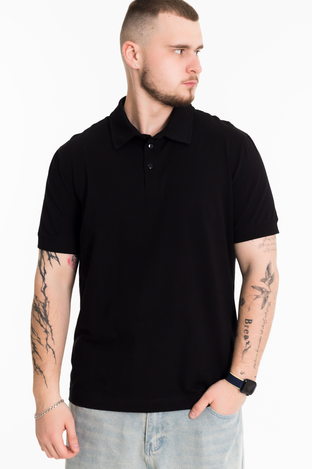 Футболка-поло из однотонного хлопкового полотна с добавлением лайкры. Втачной короткий рукав на манжете, воротник на отрезной стойке с застежкой на три пуговицы.