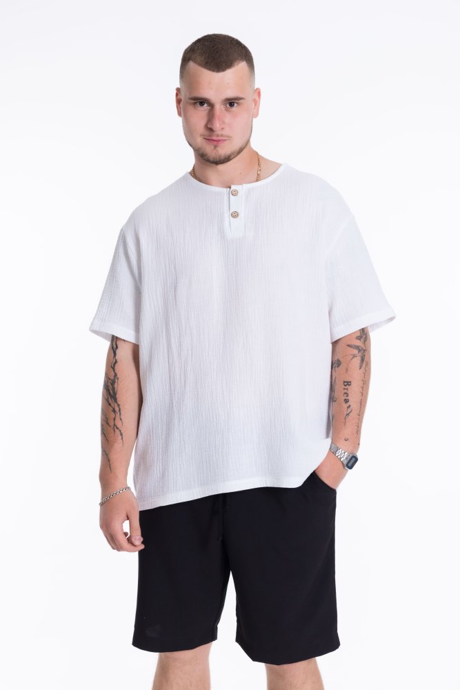 Мужская рубашка с длинным рукавом и спущенной линией плеча выполнена из муслина. Воротник-стойка, короткая застежка на пуговицы, внизу по бокам декоративные разрезы.