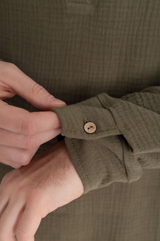 Мужская рубашка с длинным рукавом и спущенной линией плеча выполнена из муслина. Воротник-стойка, короткая застежка на пуговицы, внизу по бокам декоративные разрезы.