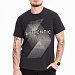 Футболка мужская, выполнена из однотонной хлопковой ткани с добавлением лайкры. Свободного кроя, короткий рукав. Горловина с круглым вырезом, отделанным планкой. Спереди нанесён принт.
