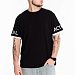 Футболка выполнена из однотонной кулирки. Рукава с принтом и отделочными планками. Футболка свободного силуэта, со спущенной линией плеча.