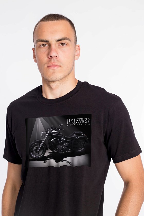 Мужская футболка выполнена из однотонного х/б полотна с лайкрой. Рукав короткий, втачной, горловина имеет круглый вырез. Спереди нанесен принт.