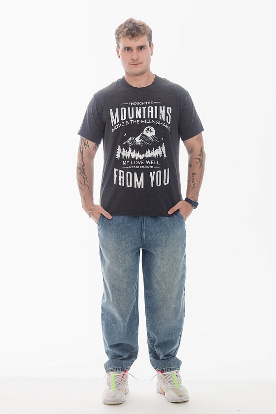 Футболка мужская, выполнена из однотонной хлопковой ткани с добавлением лайкры. Футболка с коротким рукавом и горловиной с круглым вырезом, отделанной планкой. Спереди нанесён принт.