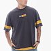 Футболка мужская в лёгком оверсайз-силуэте выполнена из однотонной кулирки с контрастной отделкой. Рукава длиной до локтя украшены вставками из отделочного полотна. По низу изделия также расположена фигурная отделочная деталь. На полочке — стильный принт, придающий футболке современный акцент.