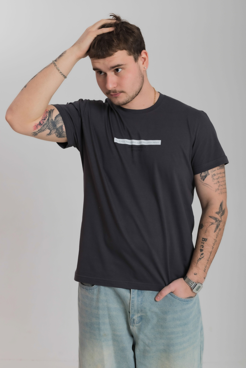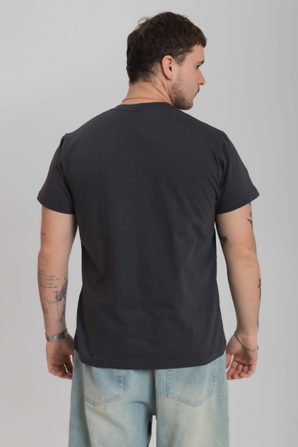 Футболка мужская, выполнена из однотонной хлопковой ткани. Свободного кроя, короткий рукав. Горловина с круглым вырезом, отделанным планкой. Спереди нанесён принт.