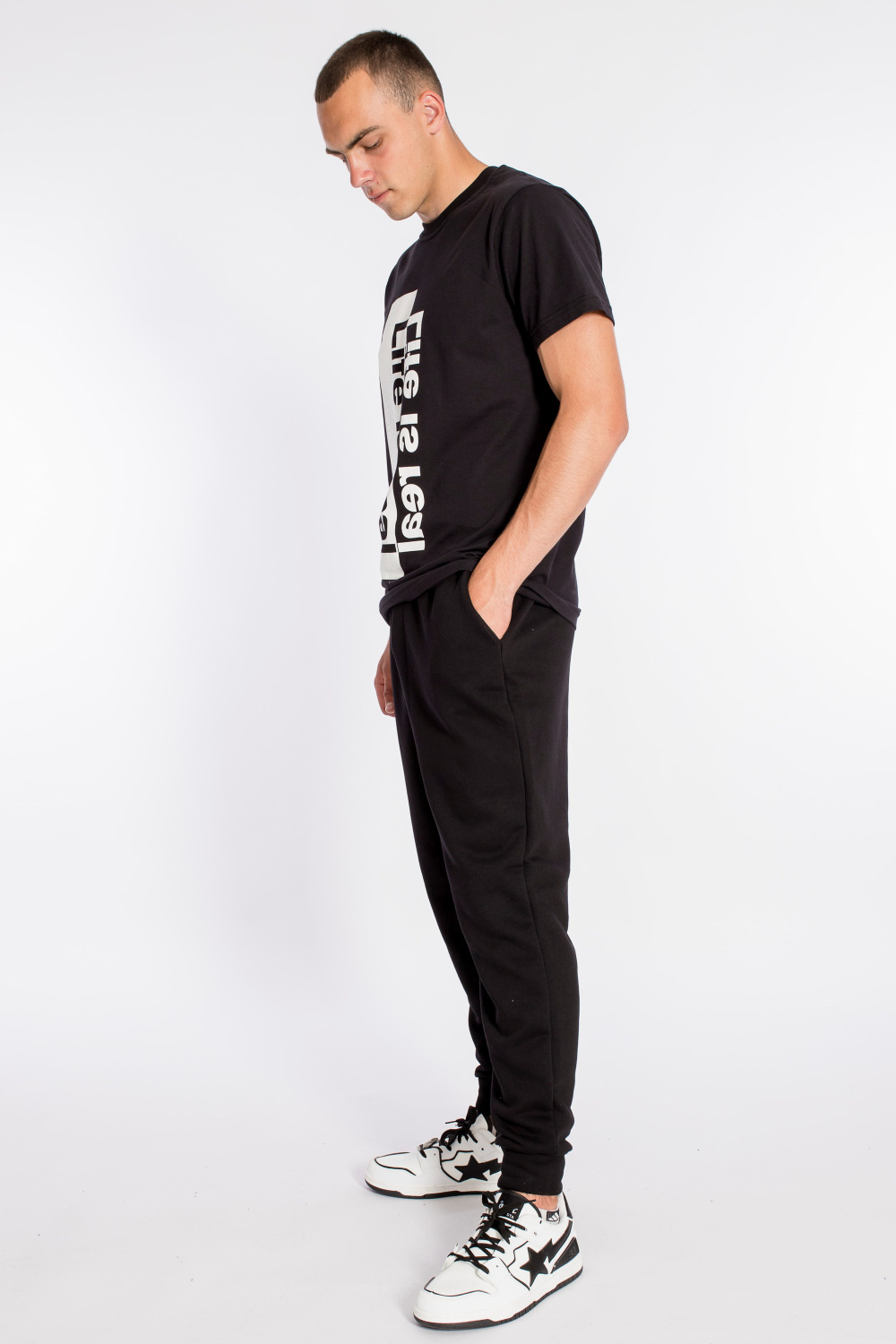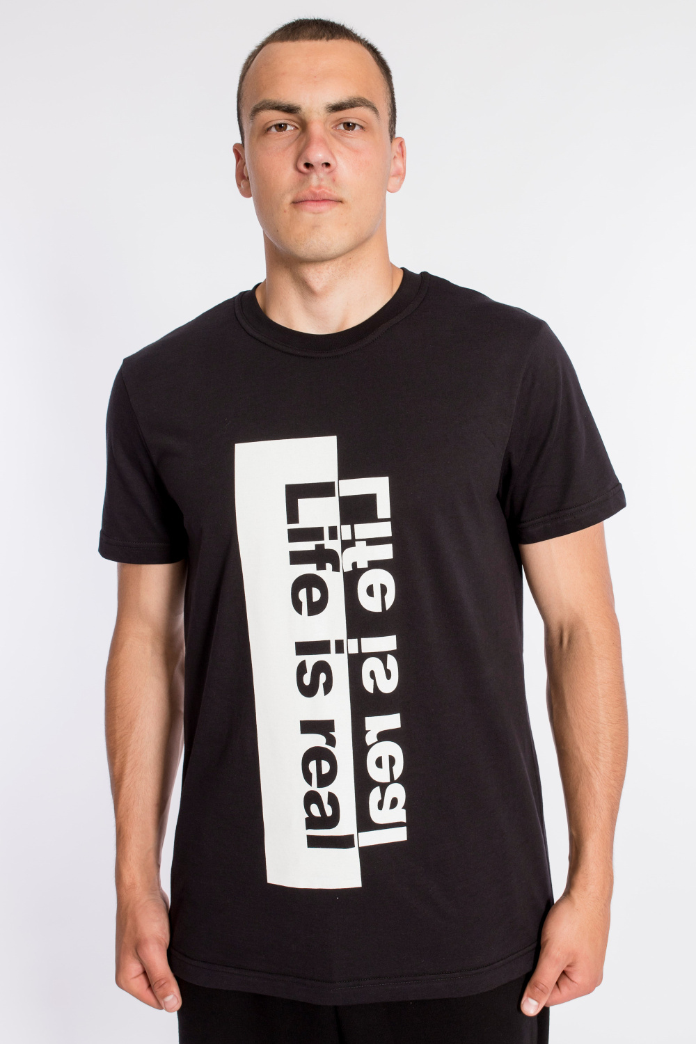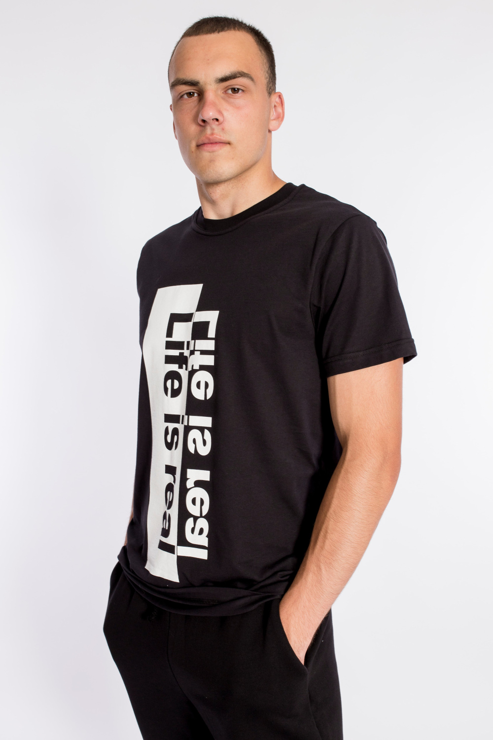 Футболка свободного силуэта из однотонного х/б полотна. Футболка с коротким рукавом, планка круглого выреза горловины выполнена из рибаны. Спереди нанесён принт.