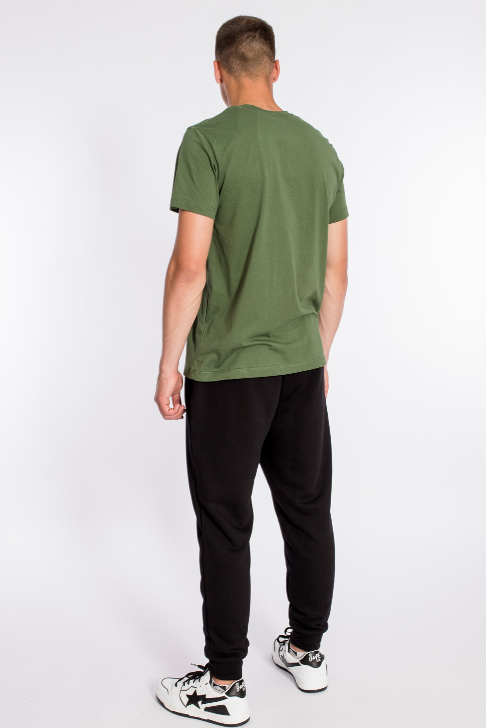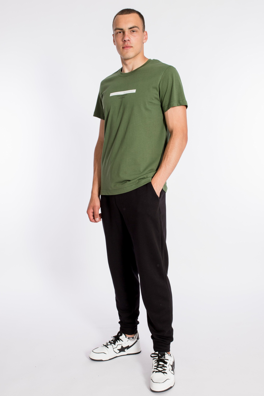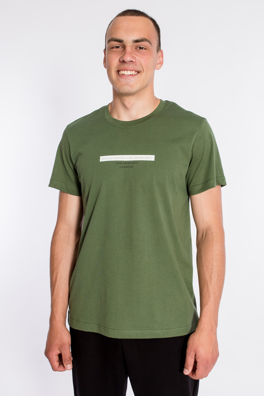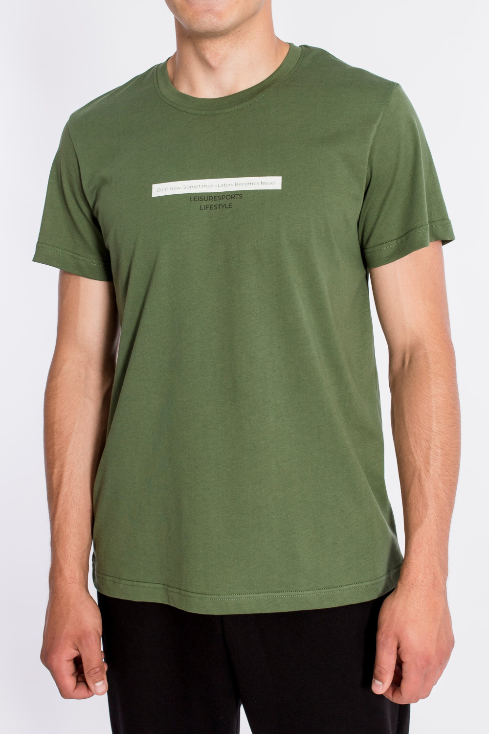 Футболка мужская, выполнена из однотонной хлопковой ткани. Свободного кроя, короткий рукав. Горловина с круглым вырезом, отделанным планкой. Спереди нанесён принт.