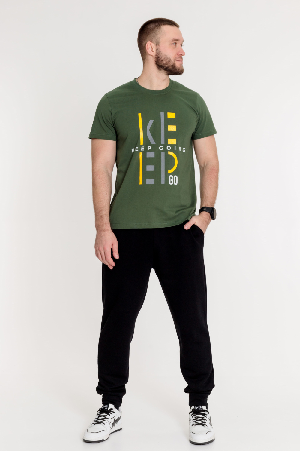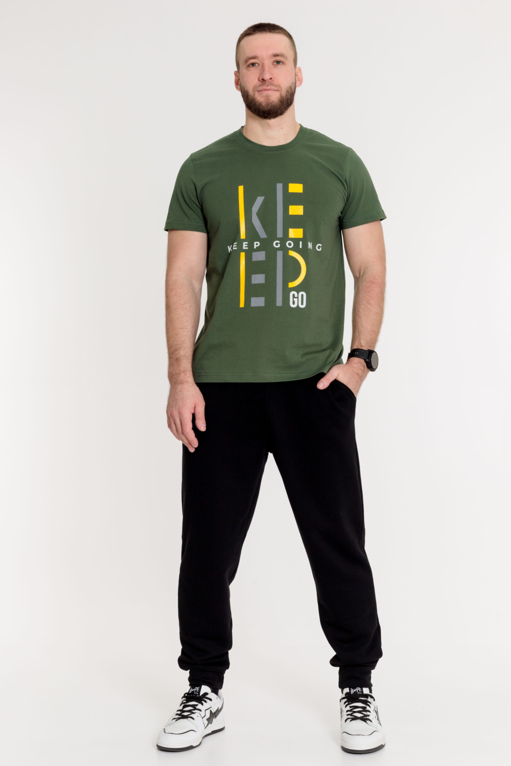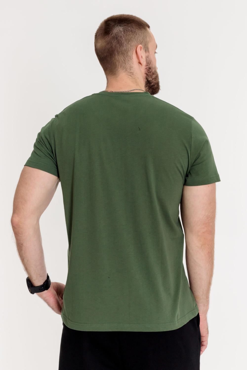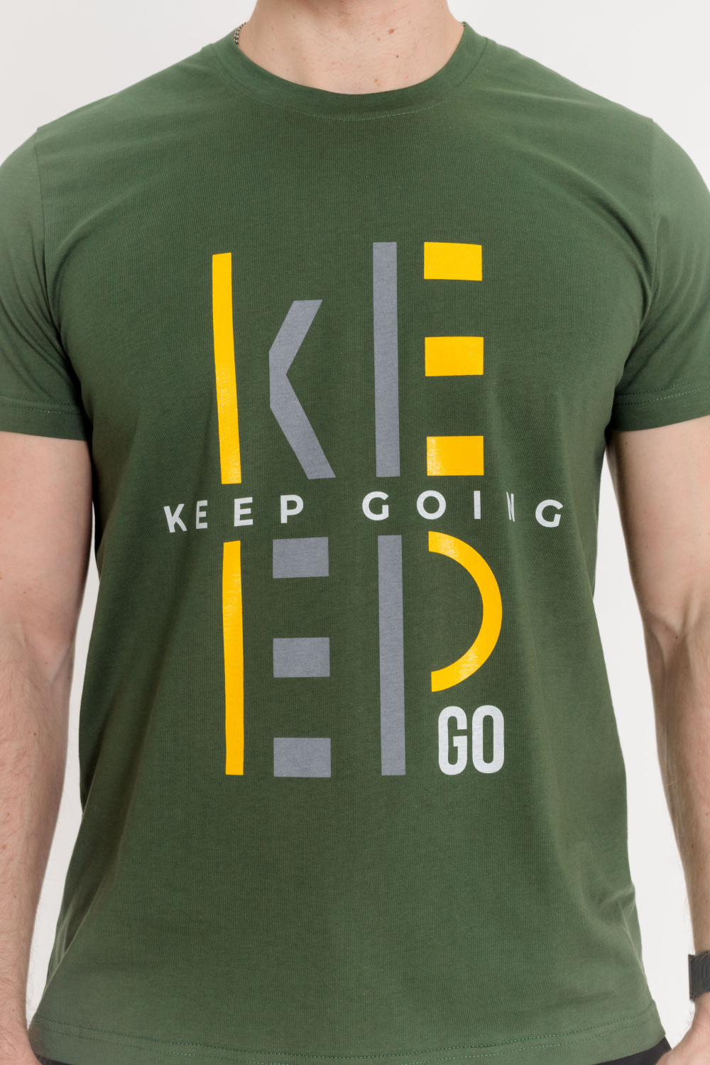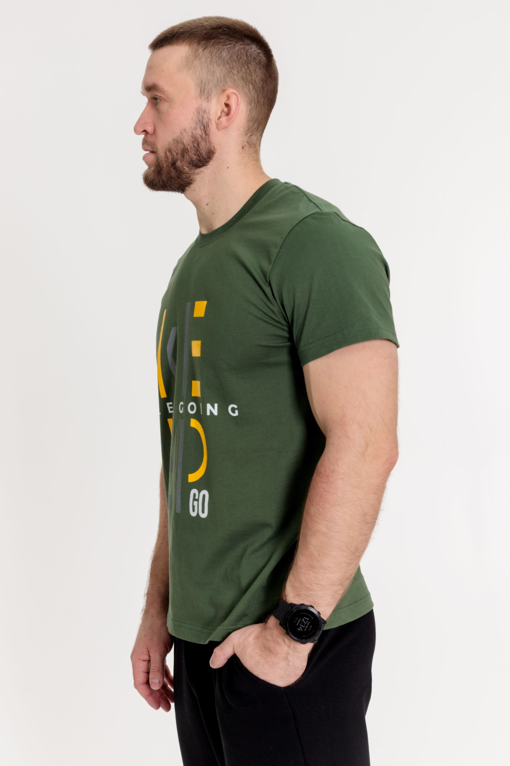 Футболка мужская, выполнена из однотонной хлопковой ткани. Свободного кроя, короткий рукав. Горловина с круглым вырезом, отделанным планкой. Спереди нанесён принт.