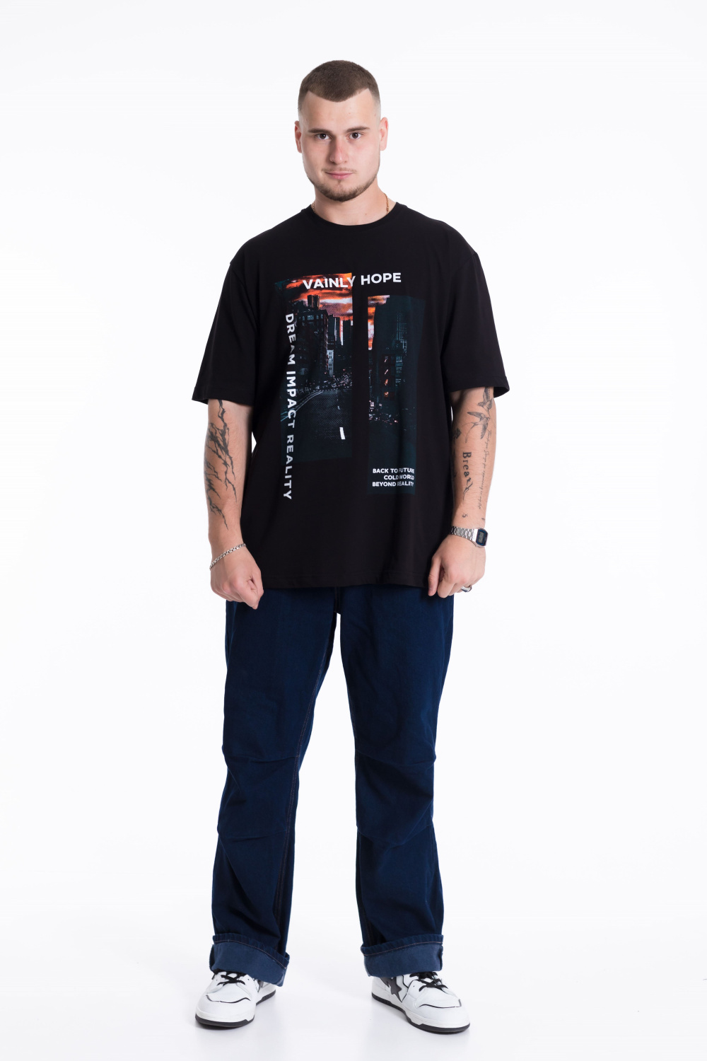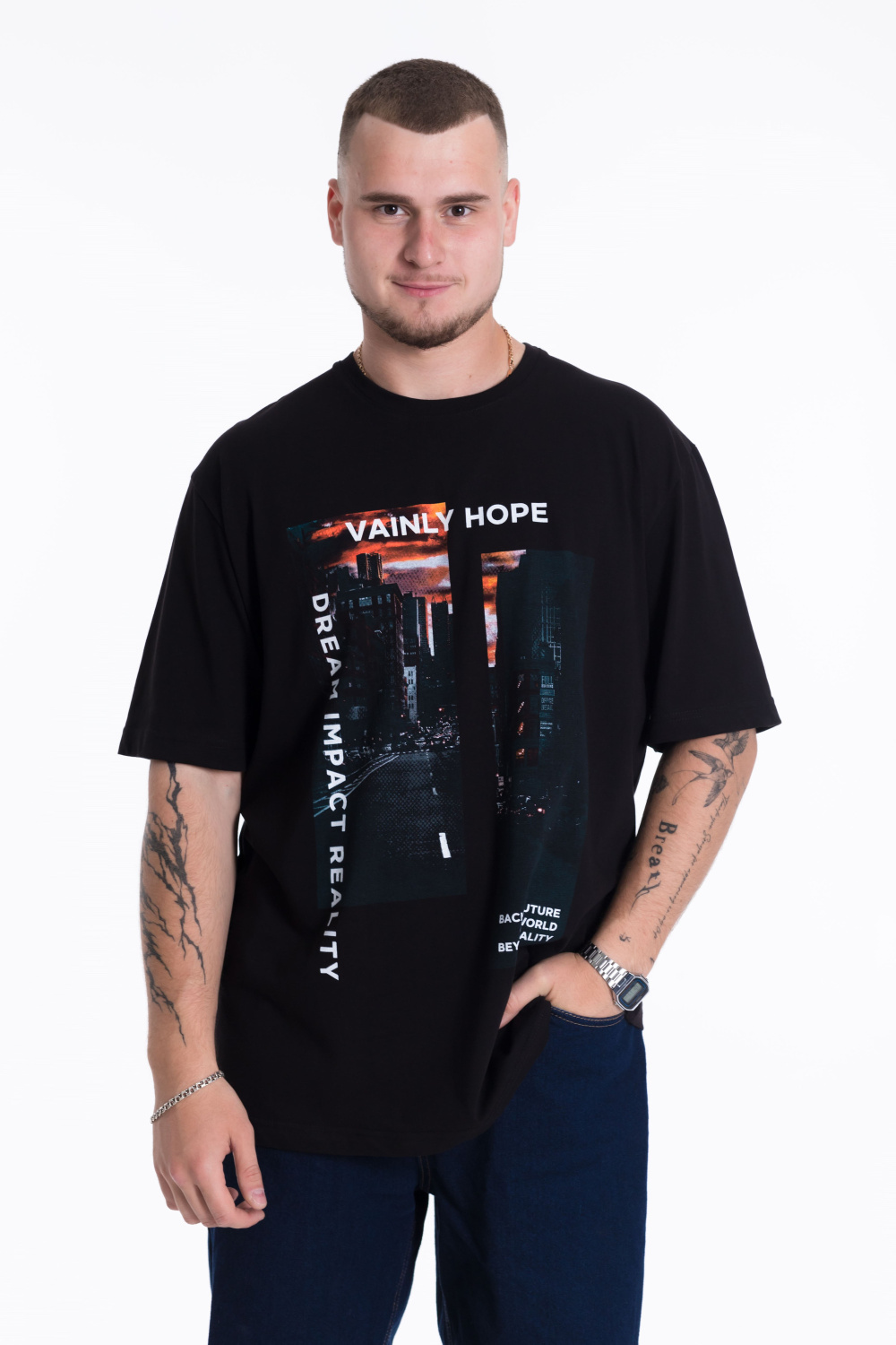Мужская хлопковая футболка с круглым вырезом горловины, втачным рукавом и принтом на полочке.