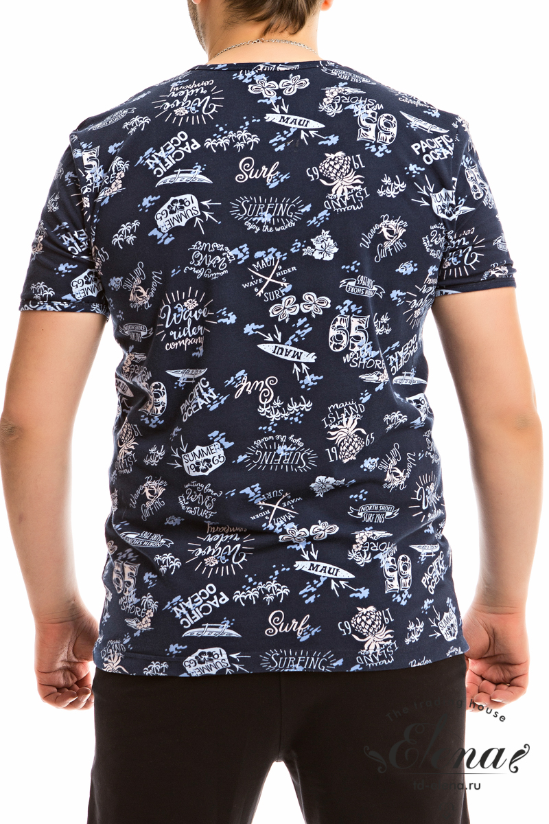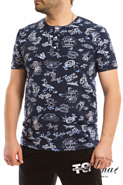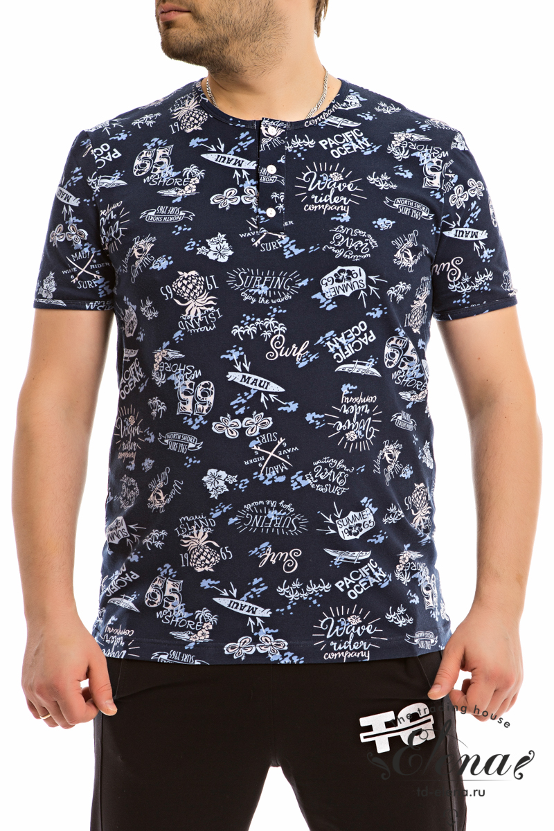 Футболка выполнена из кулирки с лайкрой с набивным рисунком. С коротким втачным рукавом, по горловине планка с застёжкой на пуговицы.