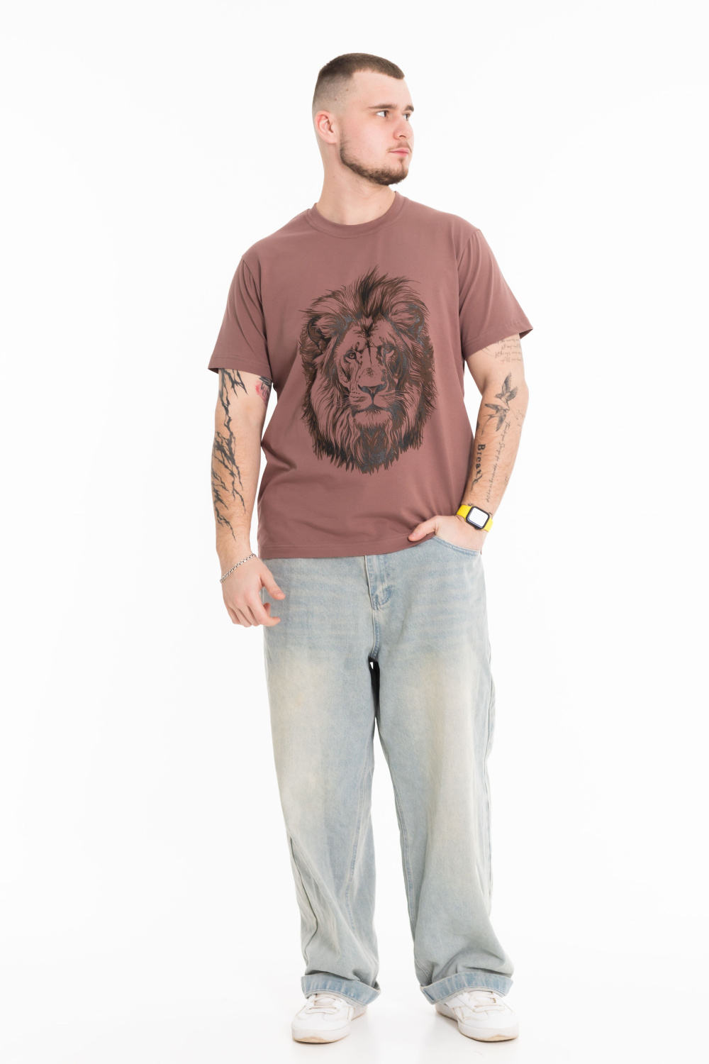 Футболка мужская, выполнена из однотонной хлопковой ткани с добавлением лайкры. Свободного кроя, короткий рукав. Горловина с круглым вырезом, отделанным планкой. Спереди нанесён принт.