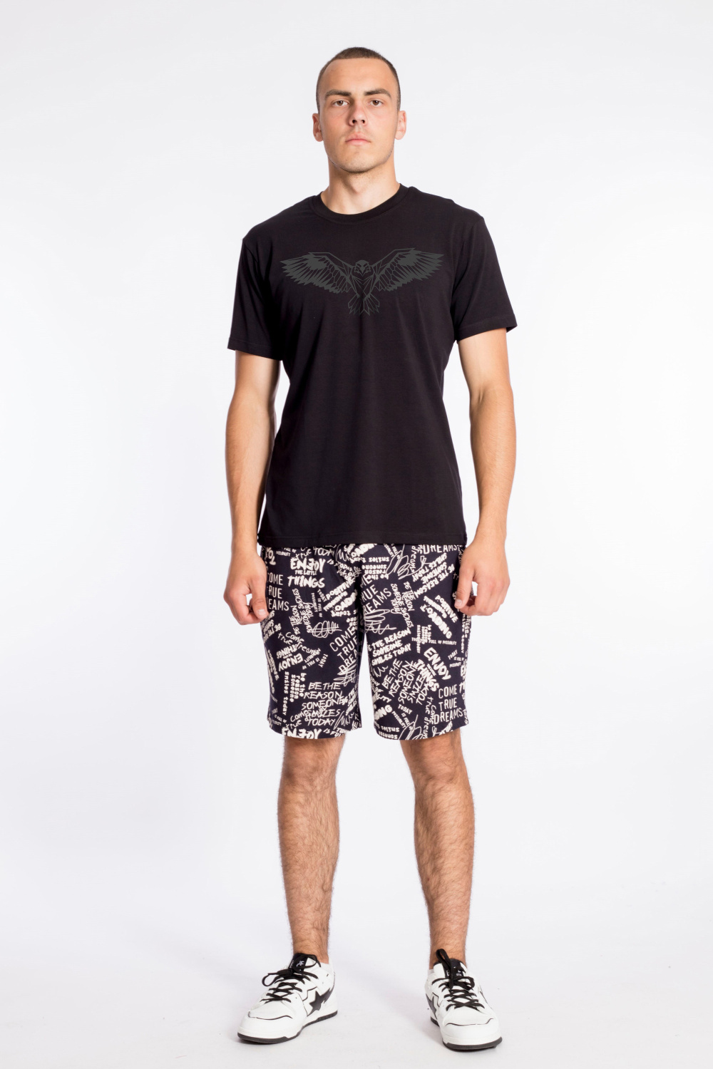 Мужская футболка с принтом свободного силуэта выполнена из однотонного х/б полотна с лайкрой. Рукав короткий, втачной, горловина имеет круглый вырез.