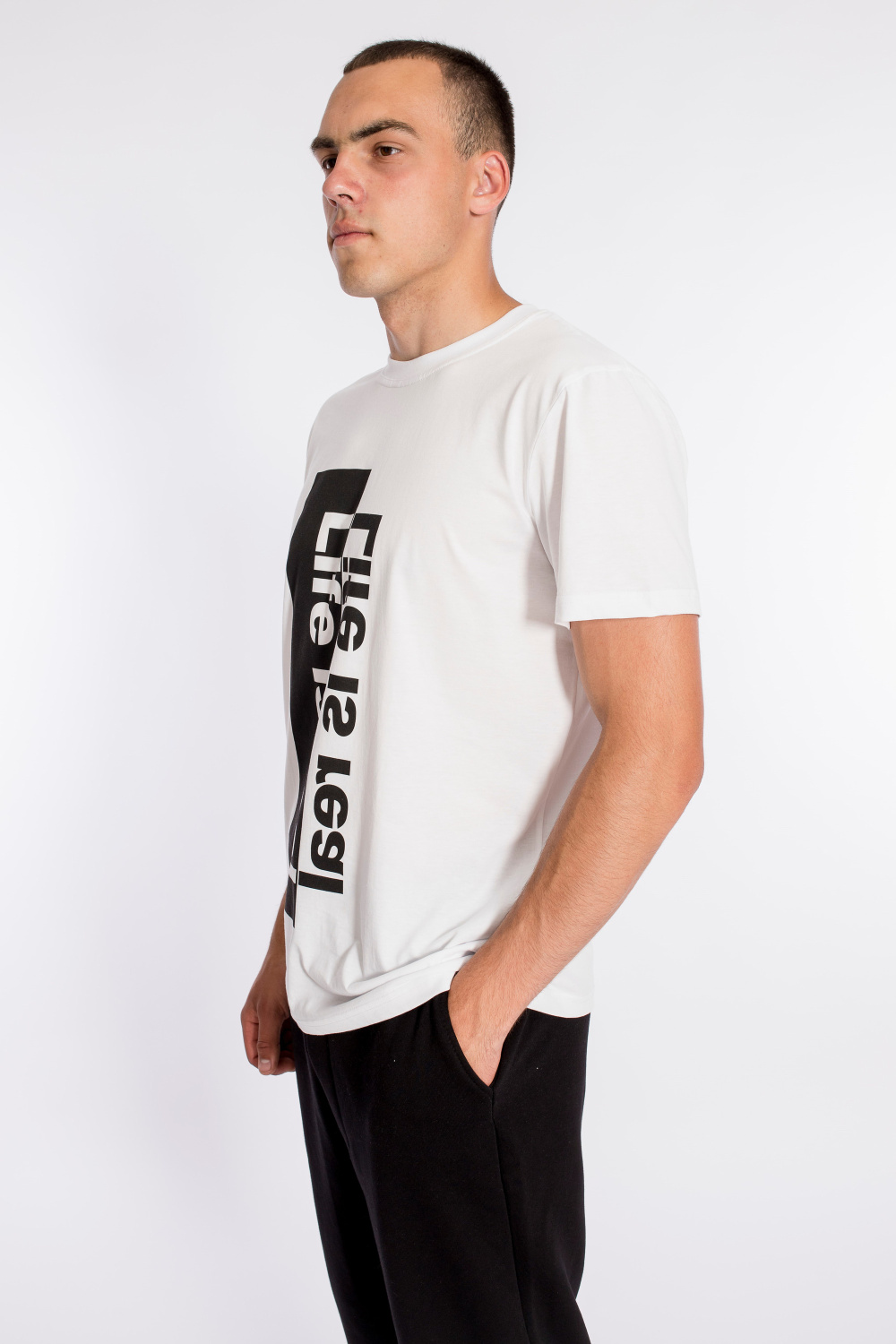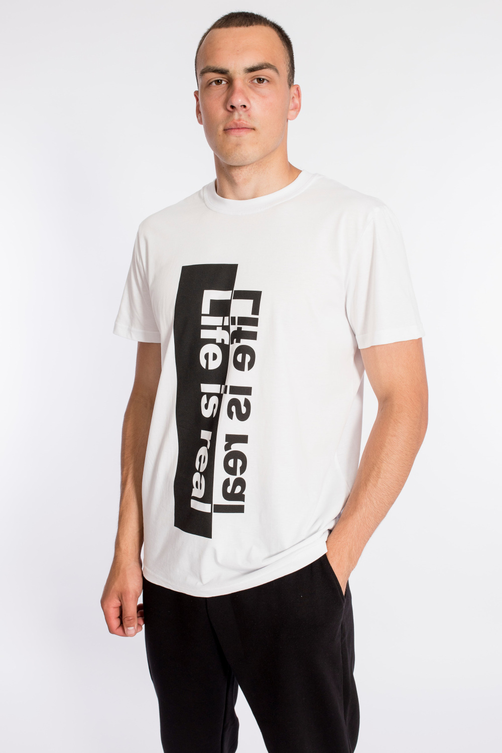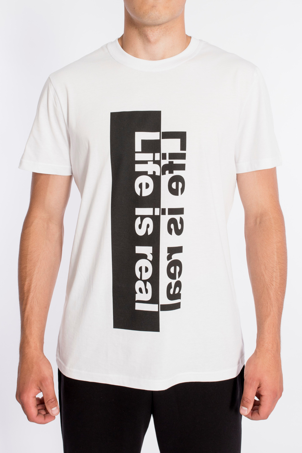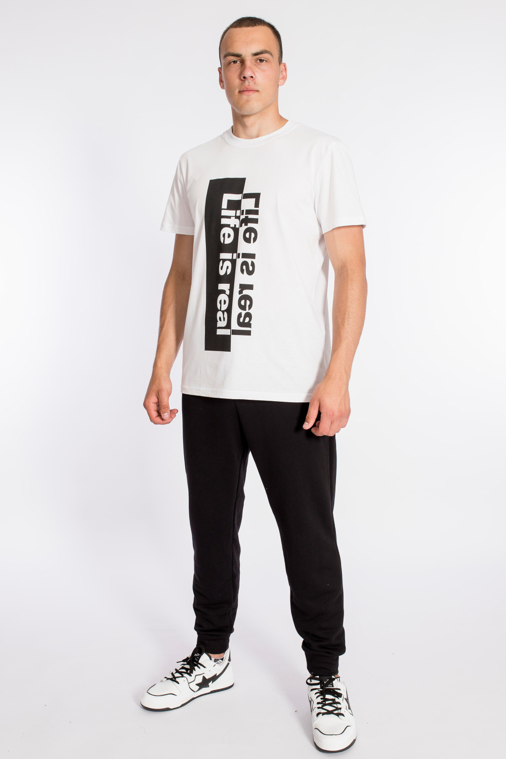 Футболка свободного силуэта из однотонного х/б полотна. Футболка с коротким рукавом, планка круглого выреза горловины выполнена из рибаны. Спереди нанесён принт.