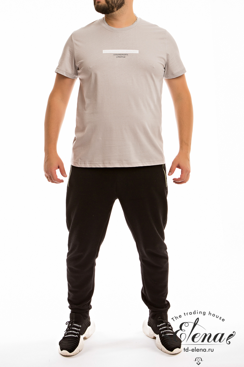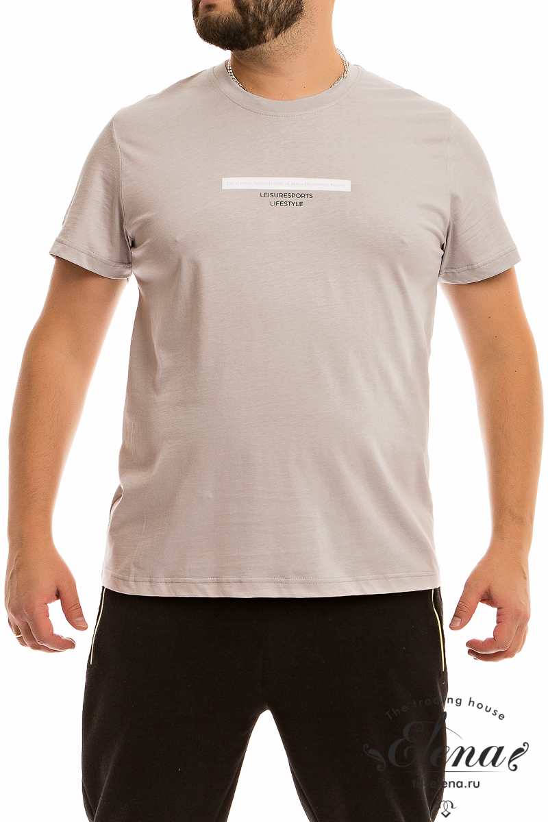 Футболка мужская, выполнена из однотонной хлопковой ткани. Свободного кроя, короткий рукав. Горловина с круглым вырезом, отделанным планкой. Спереди нанесён принт.