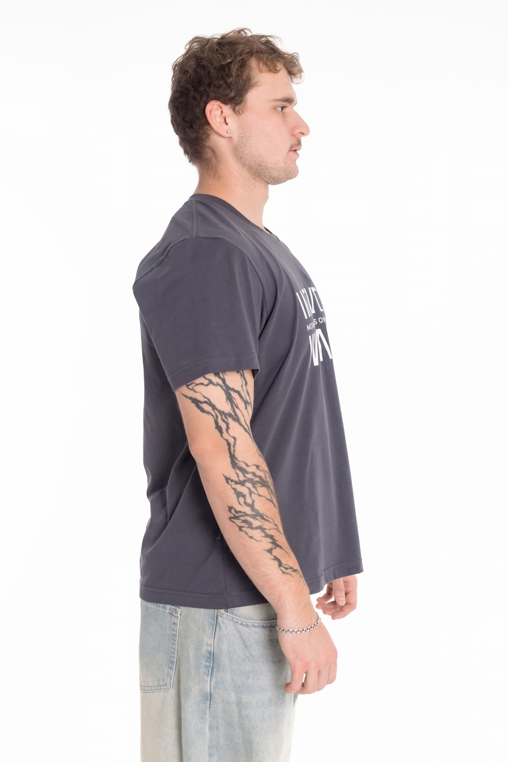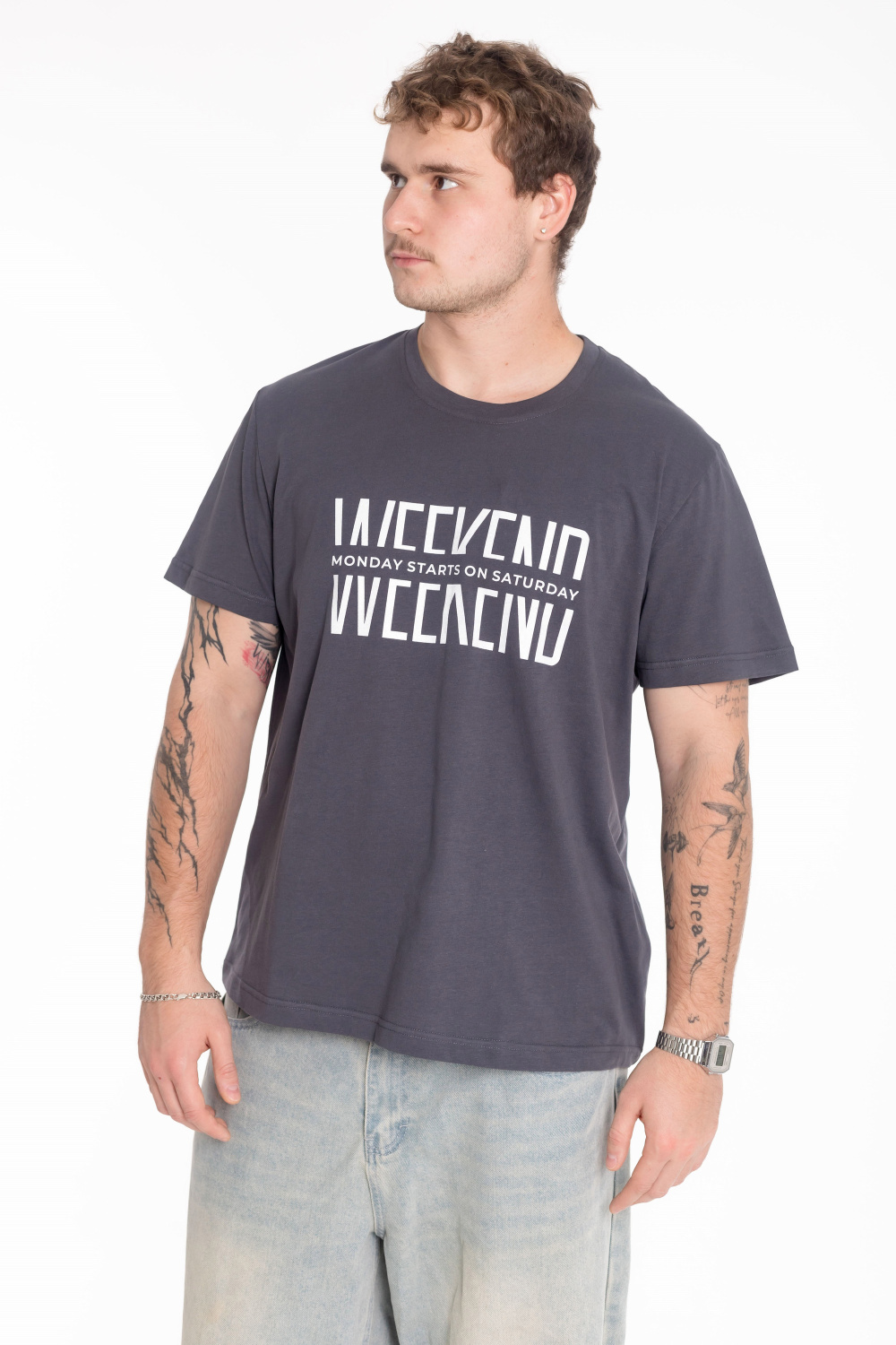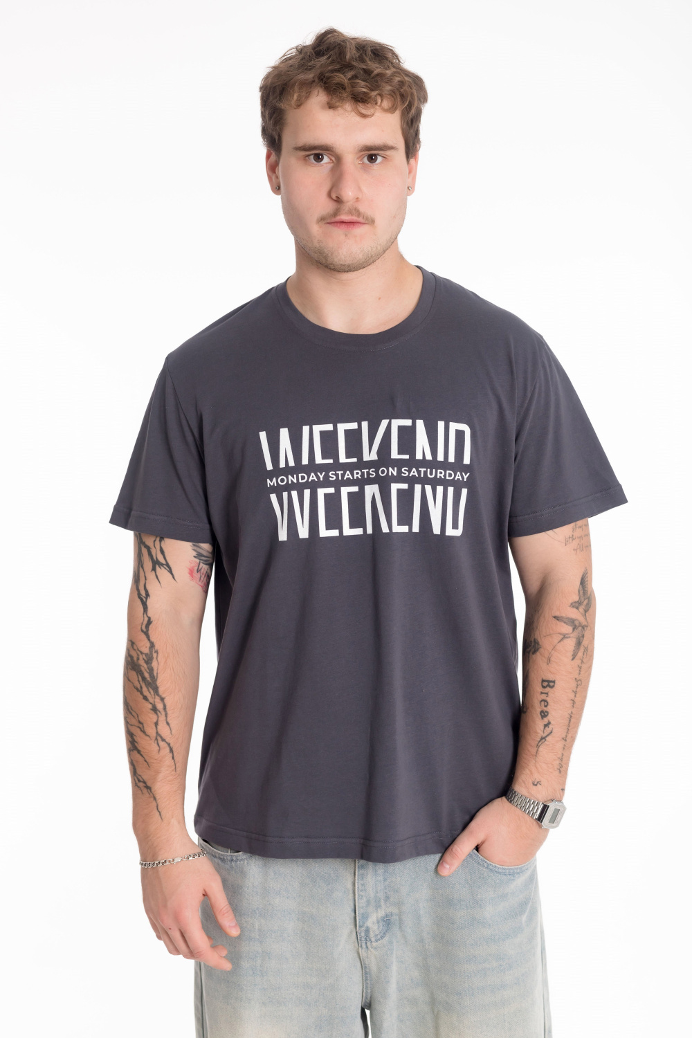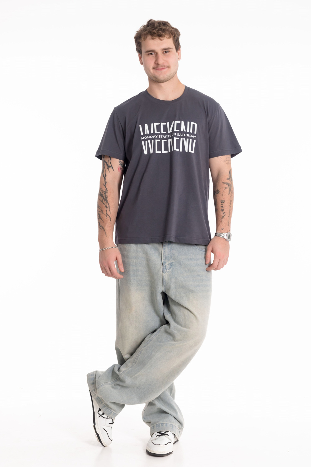 Футболка свободного силуэта из однотонного х/б полотна с коротким рукавом, круглый вырез горловины оформлен планкой. Спереди нанесён принт.