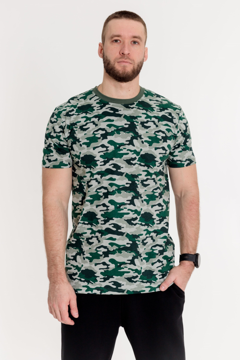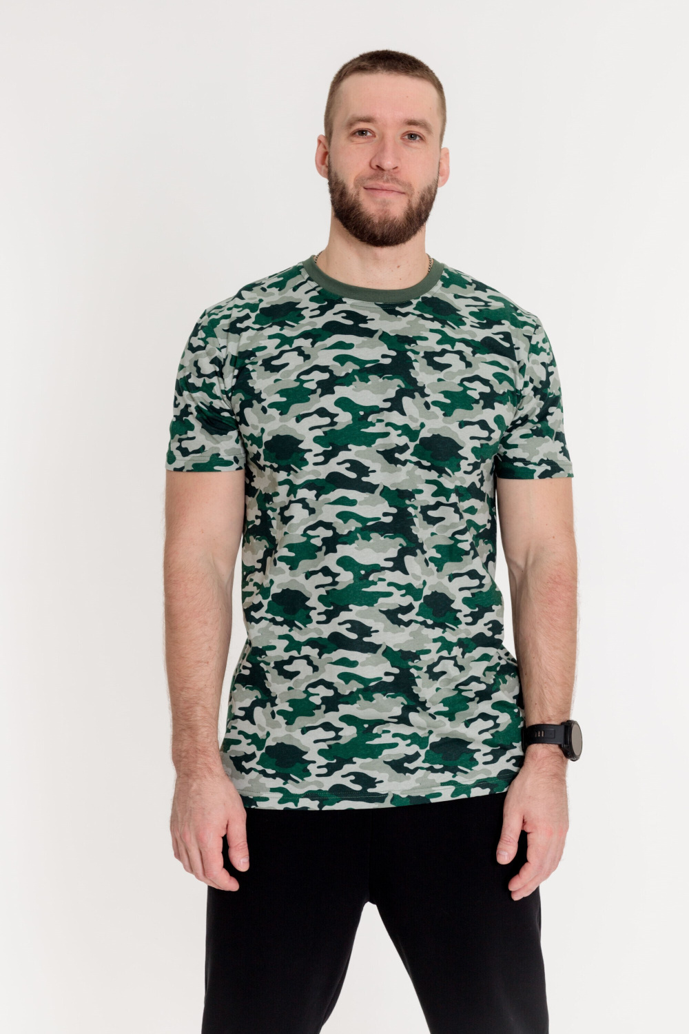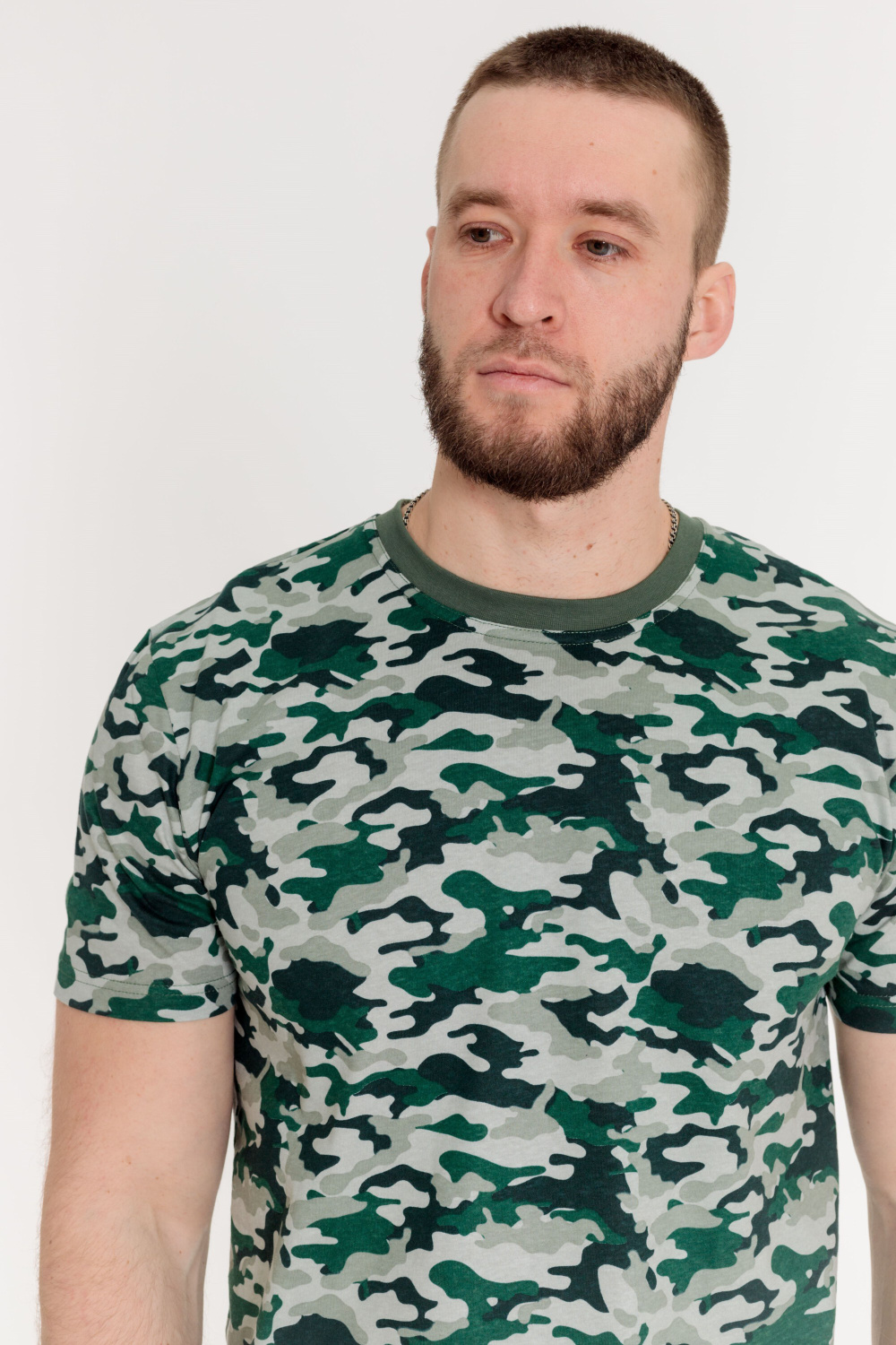 Мужская футболка выполнена из хлопкового полотна (камуфляж). Вырез горловины круглый, покрой футболки обеспечивает свободу движений. Благодаря натуральному составу ткани, изделие носится долго и с комфортом.