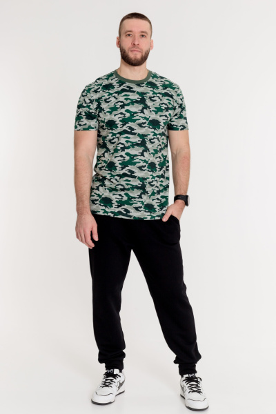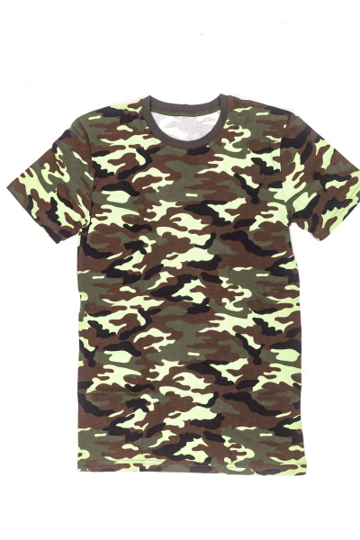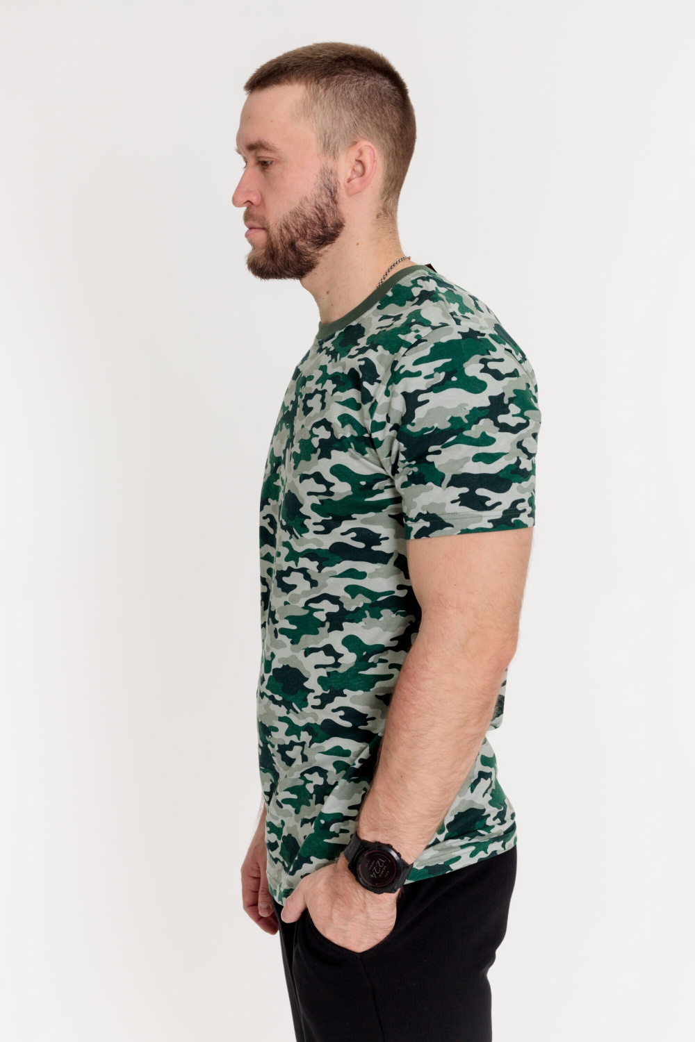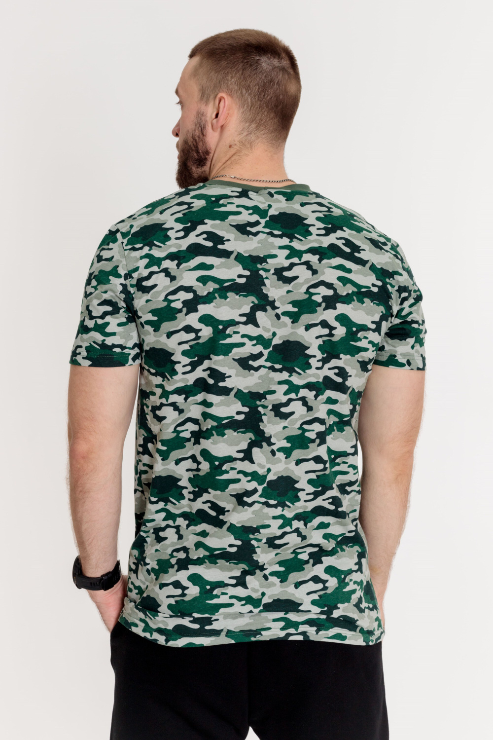 Мужская футболка выполнена из хлопкового полотна (камуфляж). Вырез горловины круглый, покрой футболки обеспечивает свободу движений. Благодаря натуральному составу ткани, изделие носится долго и с комфортом.