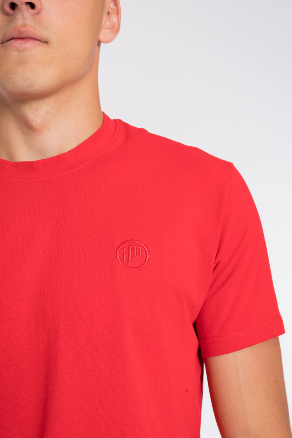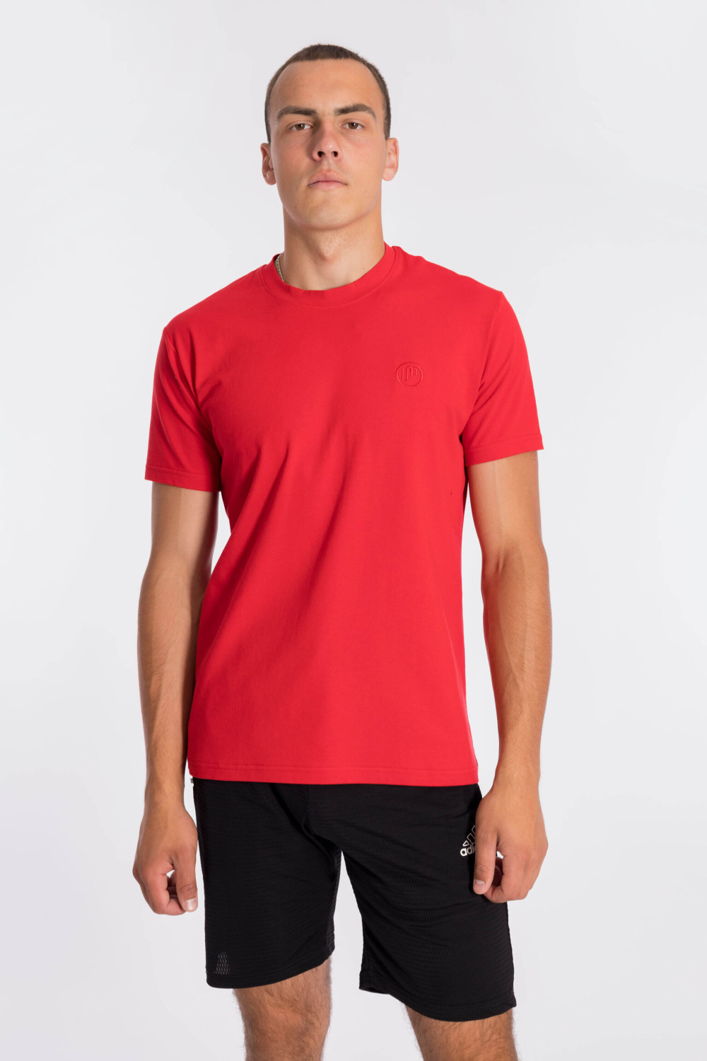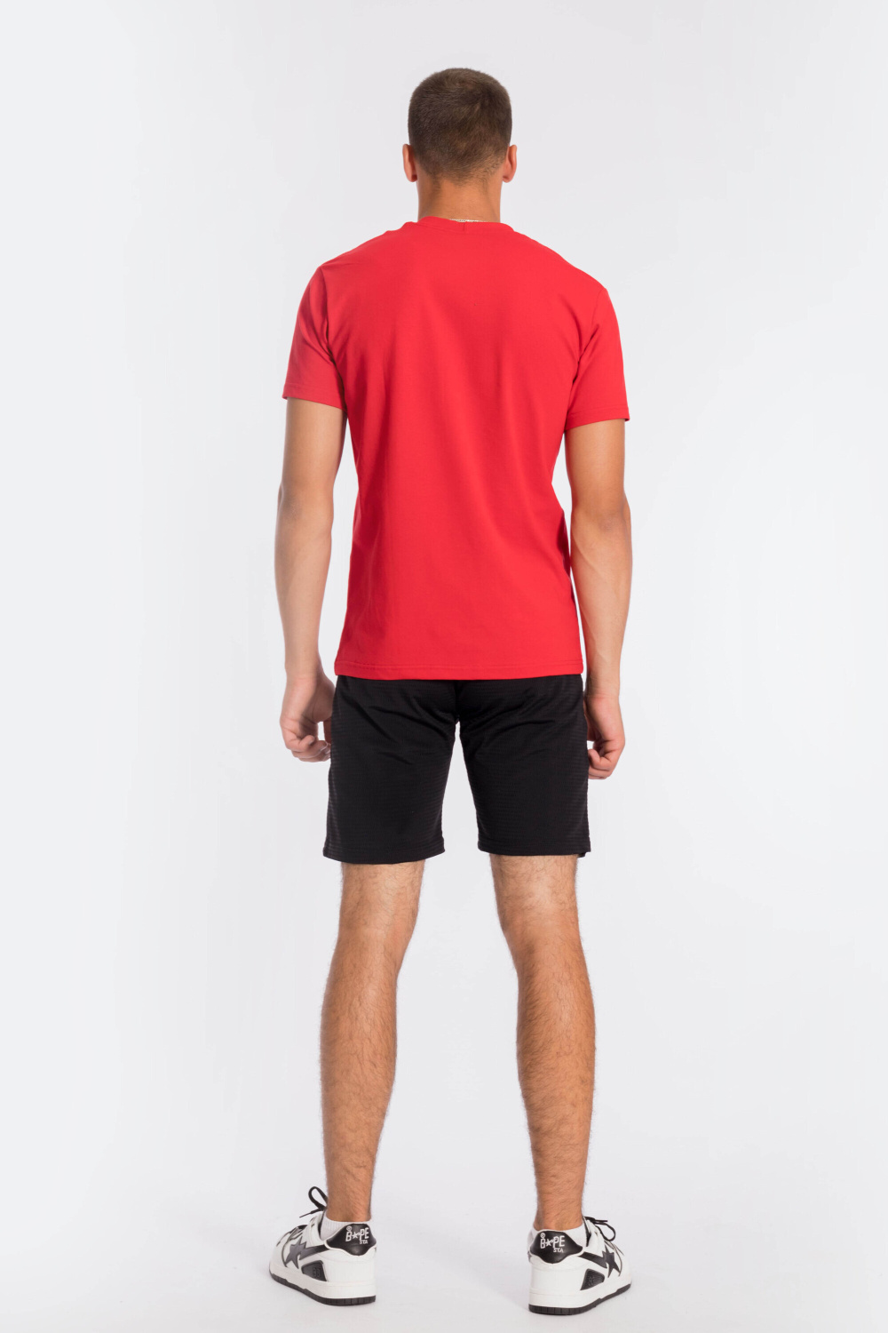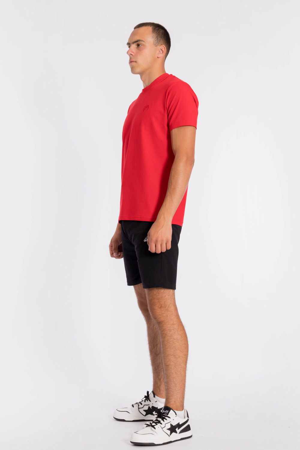 Мужская футболка выполнена из хлопкового полотна с добавлением лайкры. Горловина имеет круглый вырез, рукава короткие. Спереди вышивка.