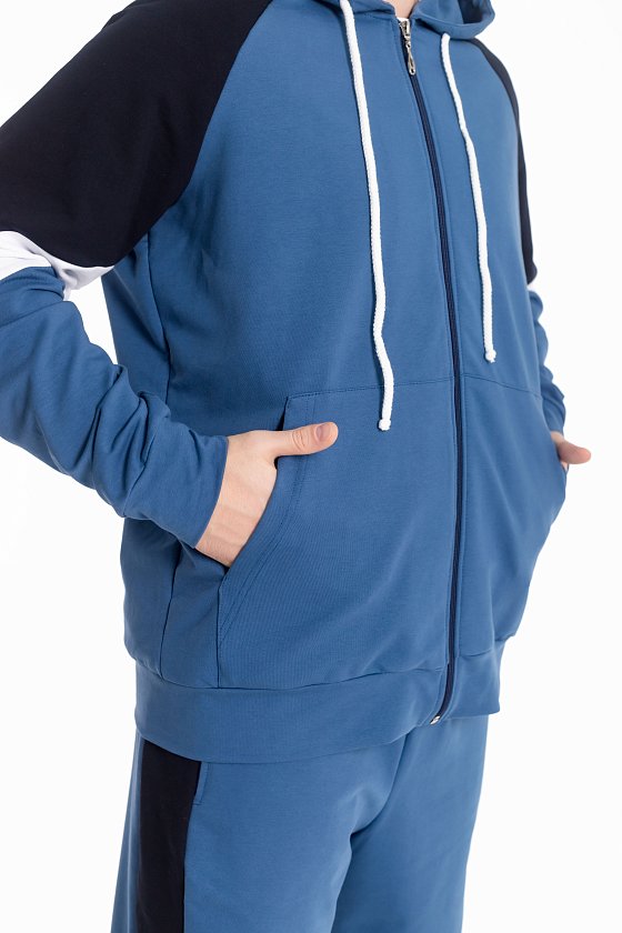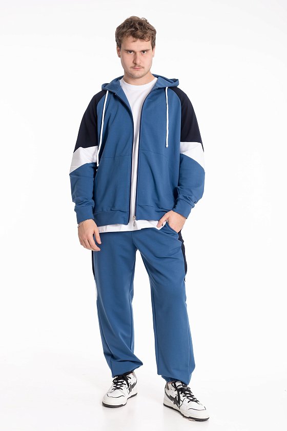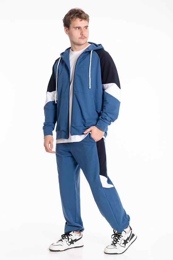 Спортивный костюм из мягкого футера с лайкрой выполнен в однотонном цвете с контрастными вставками, создающими современный динамичный образ. Комплект состоит из брюк и толстовки на молнии. Брюки с притачным поясом на резинке, боковыми карманами и манжетами по низу обеспечивают удобную посадку. Толстовка с капюшоном на кулиске, карманами «кенгуру» и застёжкой на молнию дополнена притачным поясом и манжетами. Практичный и комфортный вариант для активного отдыха и повседневной носки.