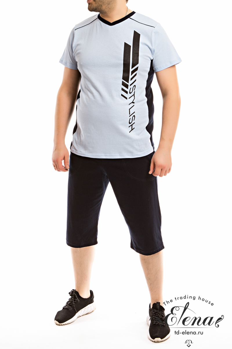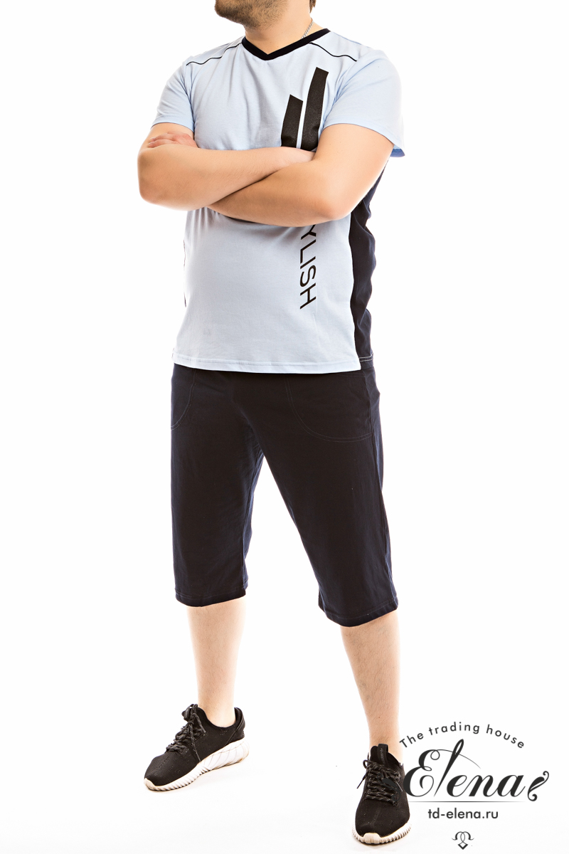 Мужской костюм выполнен из хлопкового полотна, состоит из футболки и капри. Футболка выполнена из полотен двух цветов, вырез горловины V-образный, спереди нанесён принт. Капри с поясом на резинке и карманами по бокам.