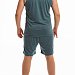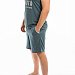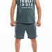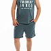 Костюм выполнен из однотонной кулирки, состоит из шорт и майки. Майка с отделочной бейкой и принтом спереди. Шорты с притачным поясом и боковыми карманами, через петли в пояс продёрнут шнур.
