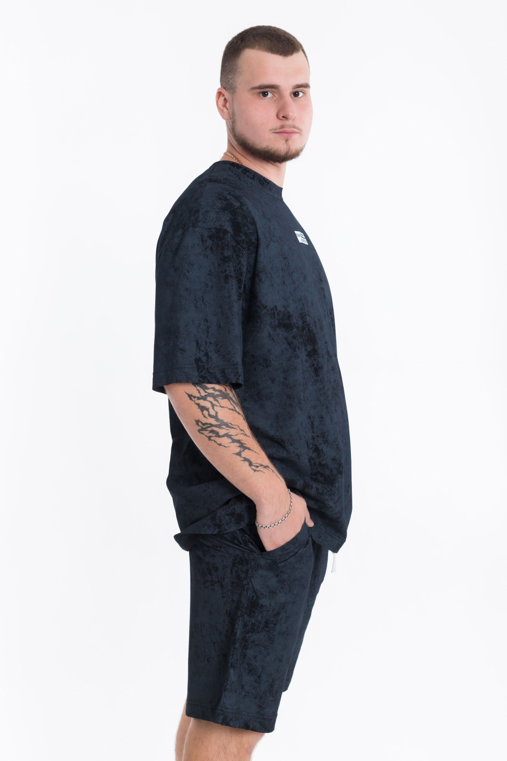 Мужской костюм — отличный выбор для повседневной носки. Он состоит из футболки и шорт, выполненных из качественного хлопкового полотна однотонного черного цвета, что обеспечивает комфорт и удобство в носке.