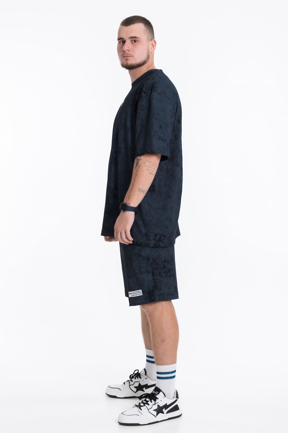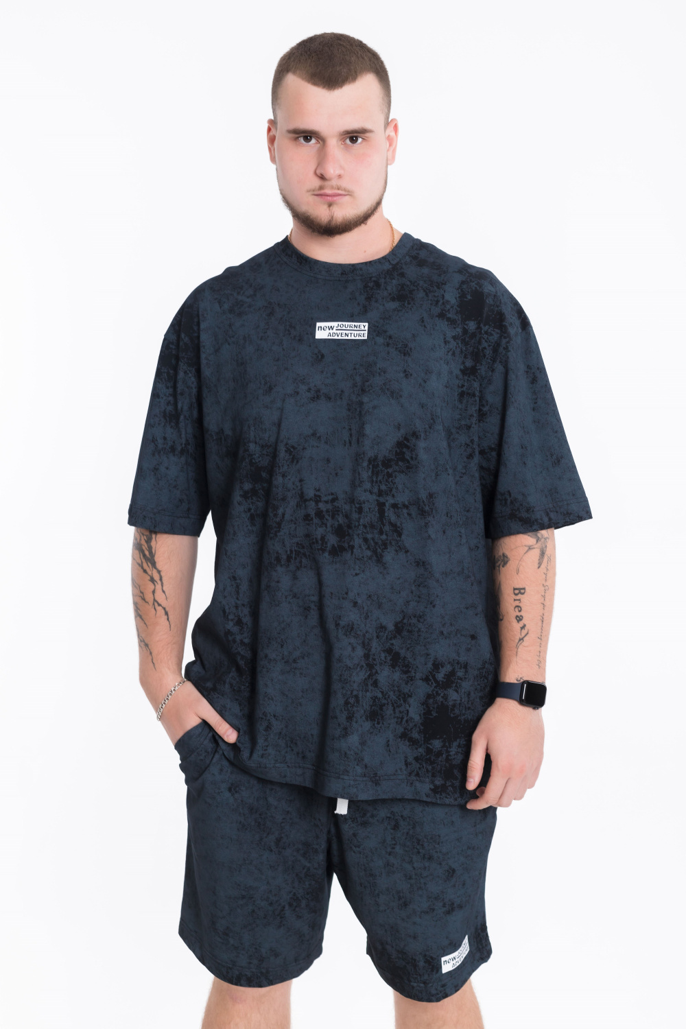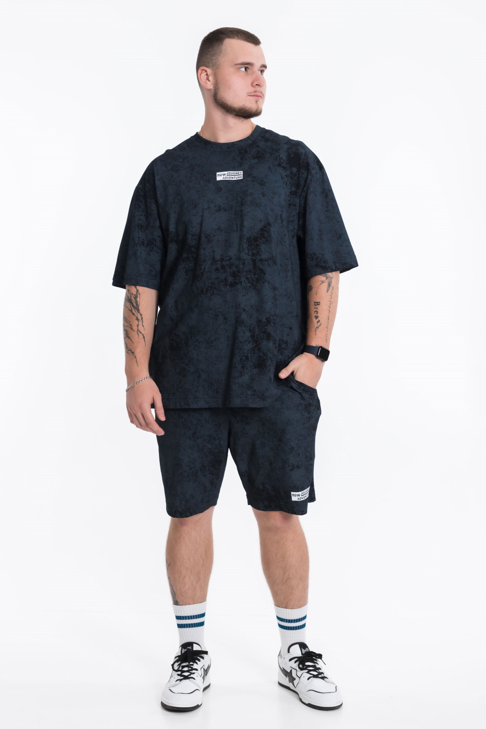 Футболка имеет спущенную линию плеча и короткие рукава, а также интересный принт спереди. Шорты оснащены карманами по бокам и поясом на широкой резинке со шнуром. Кроме того, принт на штанинах шорт соответствует принту на футболке, создавая стильный и гармоничный образ.